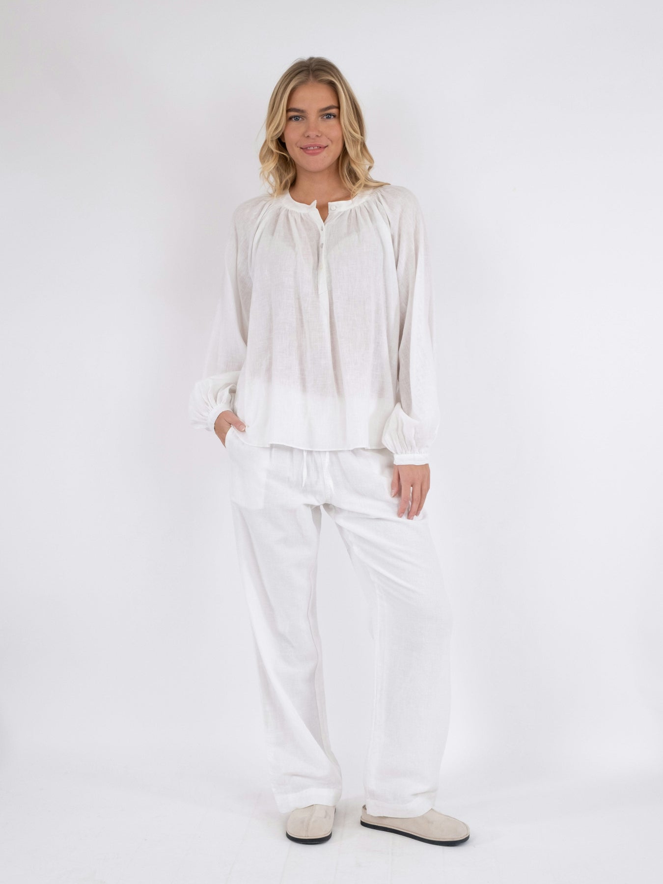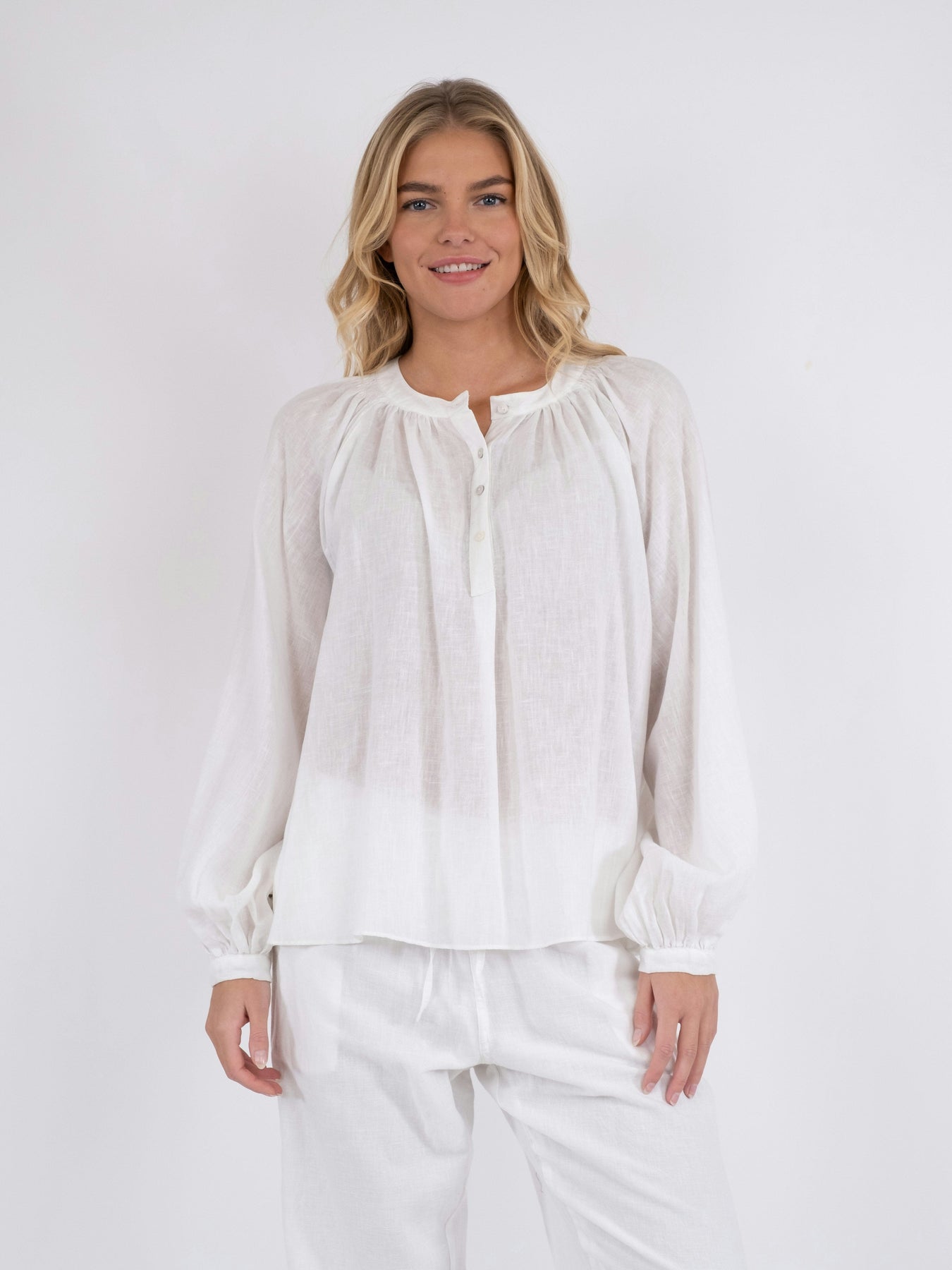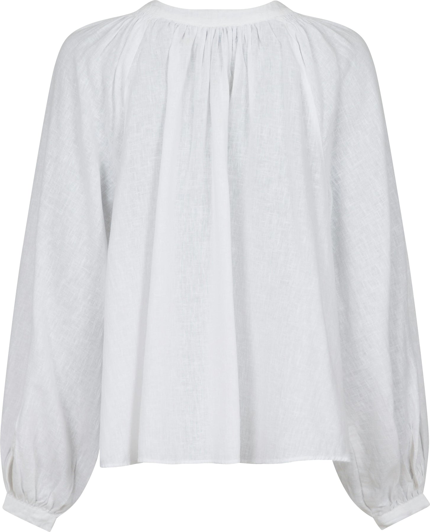 Vit blus från Neo Noir med smockdetaljer vid halsen och puffärmar. Blusen har en lös passform och är gjord av mjuk bomull med knapplåsning fram.