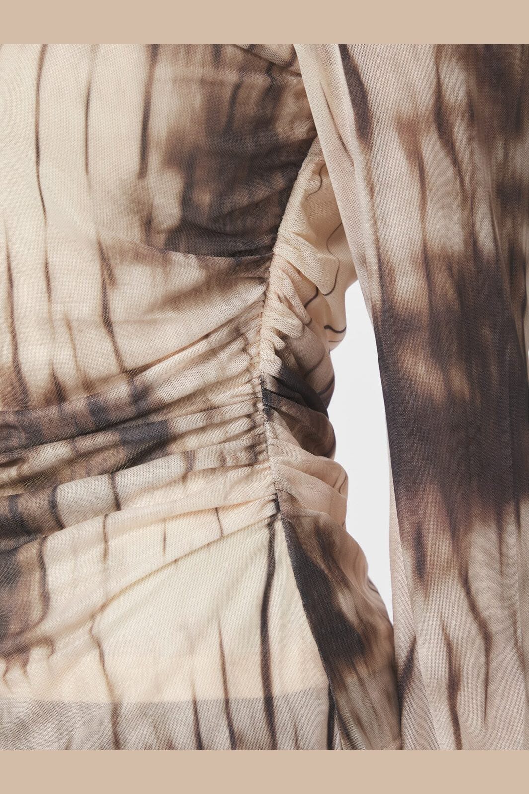 Meshblus från Neo Noir i brun nyans med ett urblekt tryck. Blusen har rynkdetaljer vid midjan och långa ärmar med vidde.