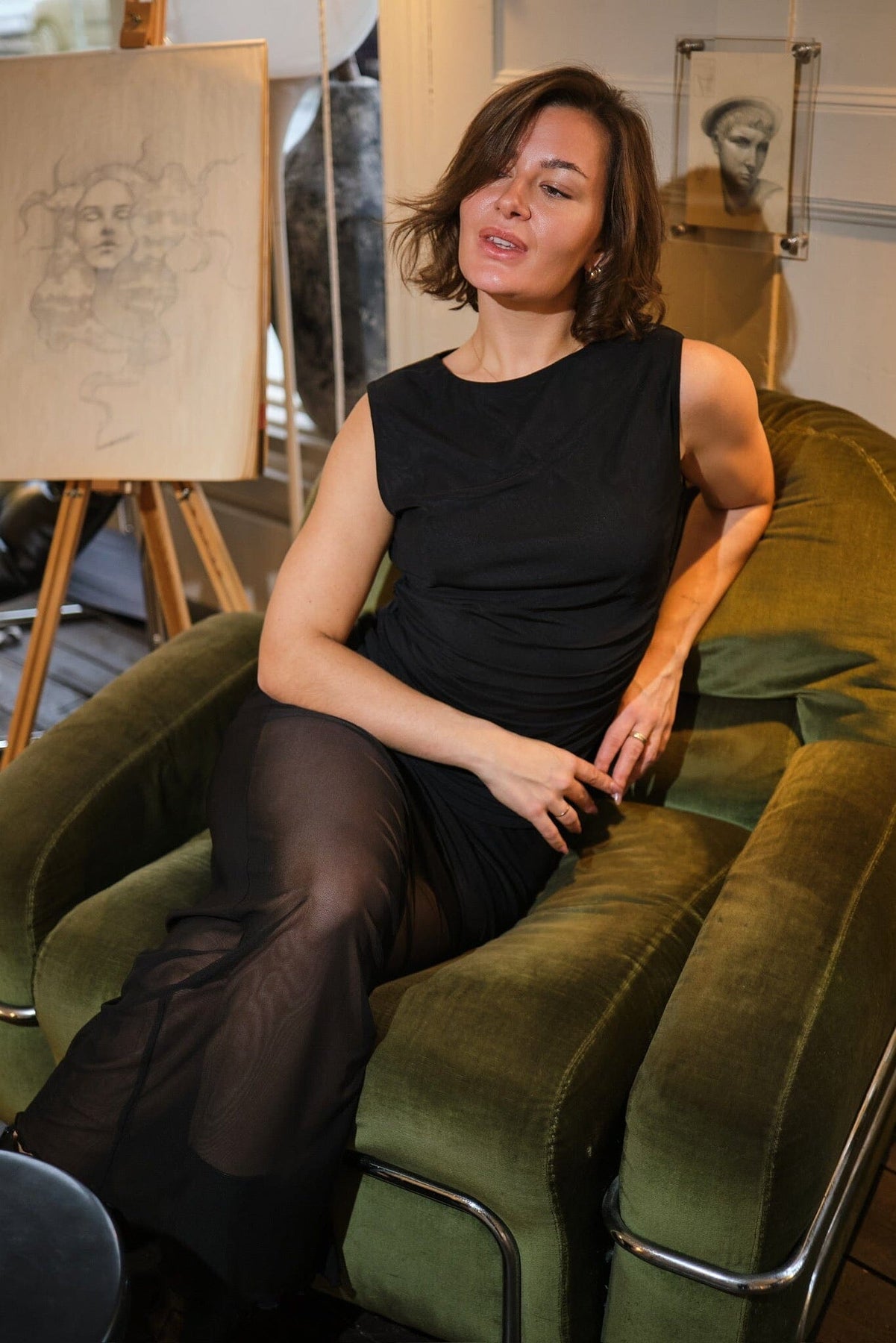 Svart mesh-topp från Neo Noir med rund halsringning. Toppen har rynkdetaljer längs sidorna och på axlarna, vilket ger den ett draperat uttryck.
