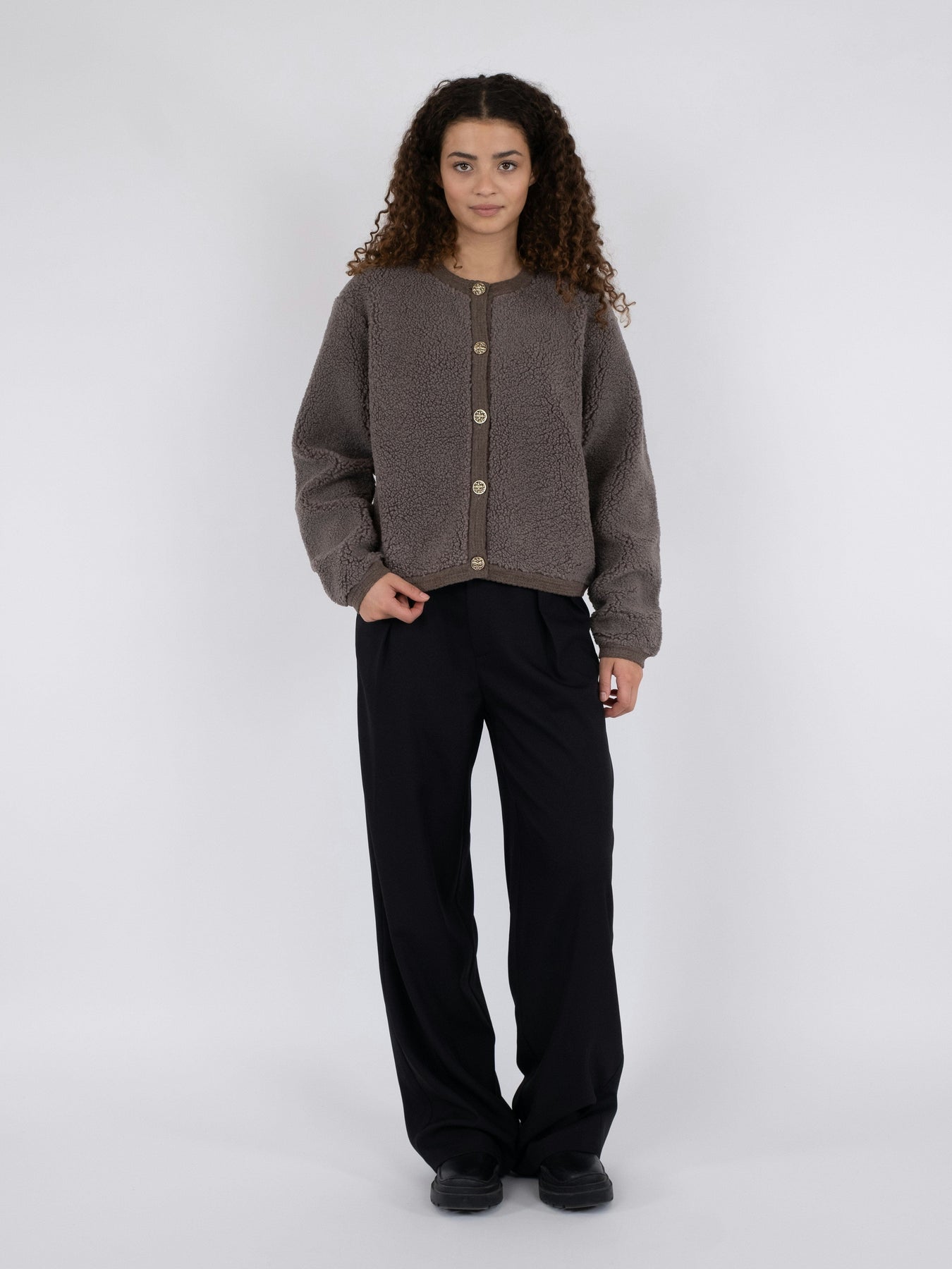 Stickad cardigan från Neo Noir i en dämpad järnfärg. Den mjuka, fluffiga stickningen har en rund halsringning och knappar fram som gör den lätt att öppna och stänga.