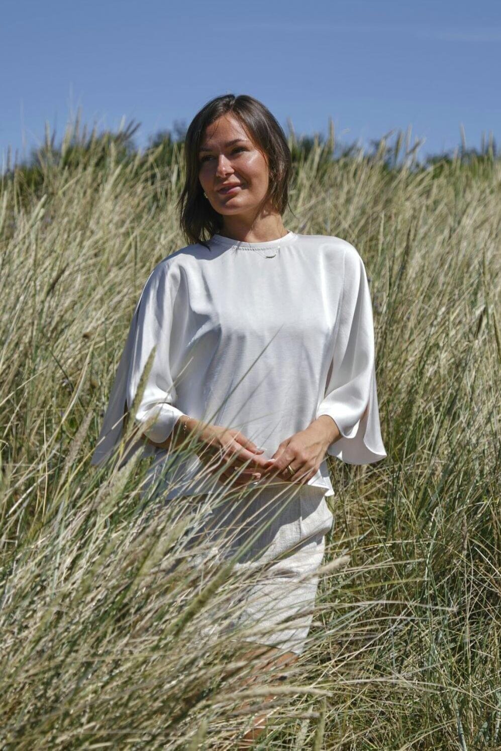 Satinblus från Neo Noir i en ljus pärlfärg. Blusen har breda ärmar med slitsar och en rund halsringning med nyckelhålsdetalj i nacken.