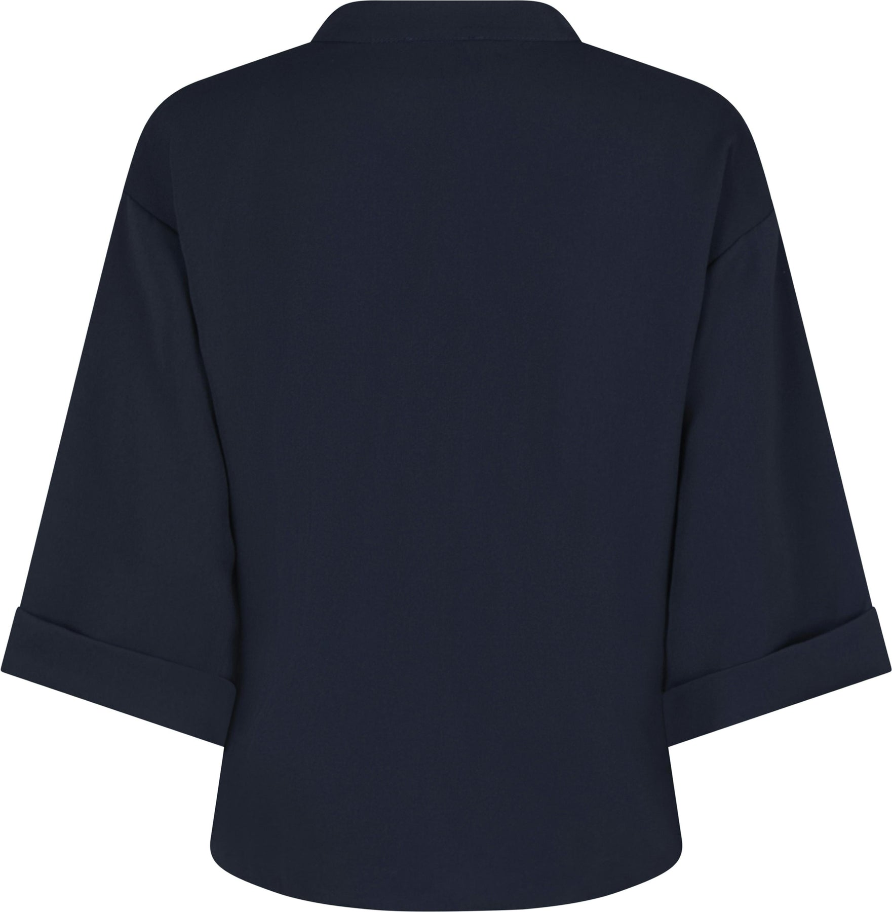 Mörkblå blus från Neo Noir i mjuk crepe. Den har en lös passform med boxy snitt, v-ringning och 3/4 ärmar med uppvik.