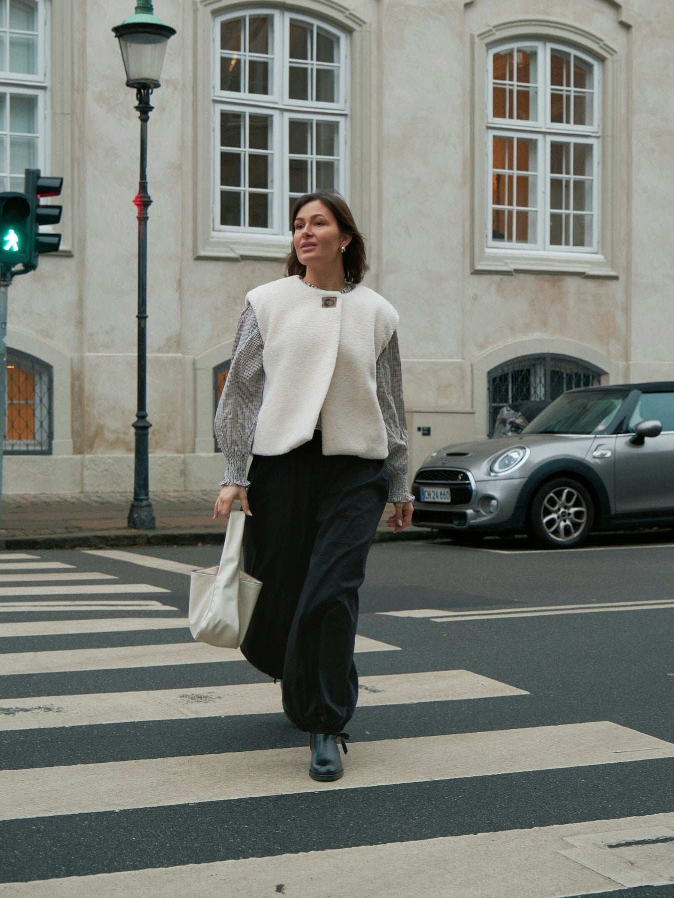 - Modellen är 176 cm lång och bär storlek 36