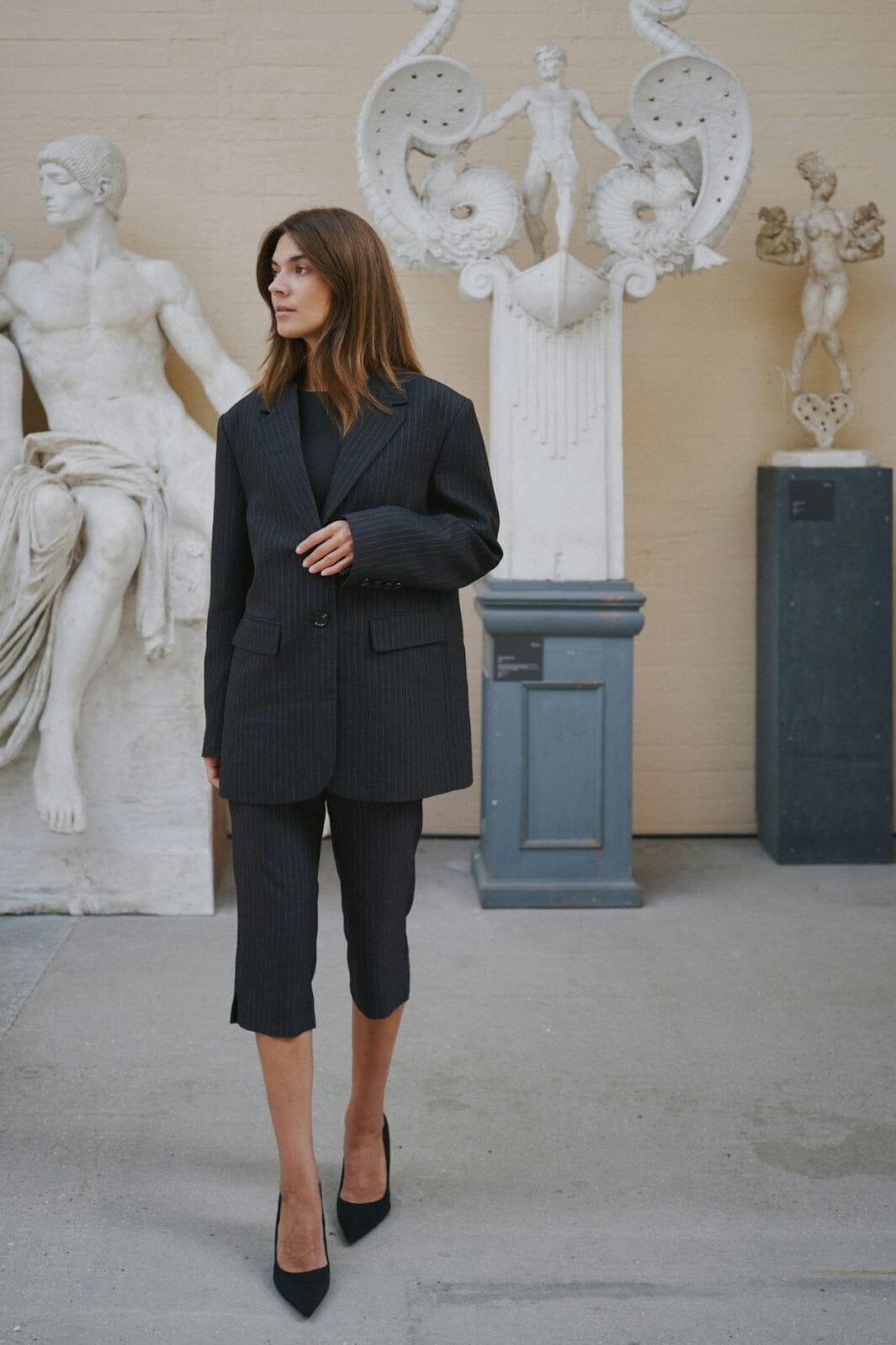 Gråblå blazer från Neo Noir med nålrandigt mönster. Den har en oversized passform och knappar både fram och bak. V-ringning och långa ärmar ger blazern en klassisk stil.