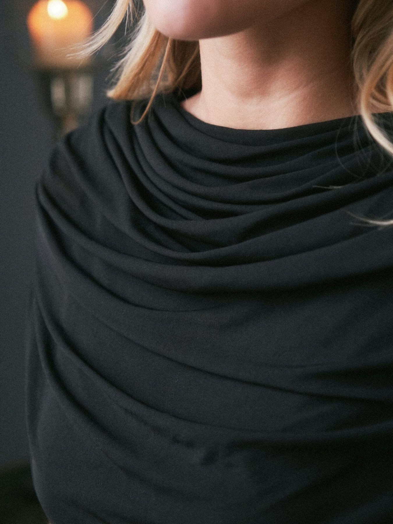 Svart meshklänning från Neo Noir med draperad design. Klänningen har rynkor längs sidosömmen och en vattenfallseffekt framtill som skapar rörelse i tyget.