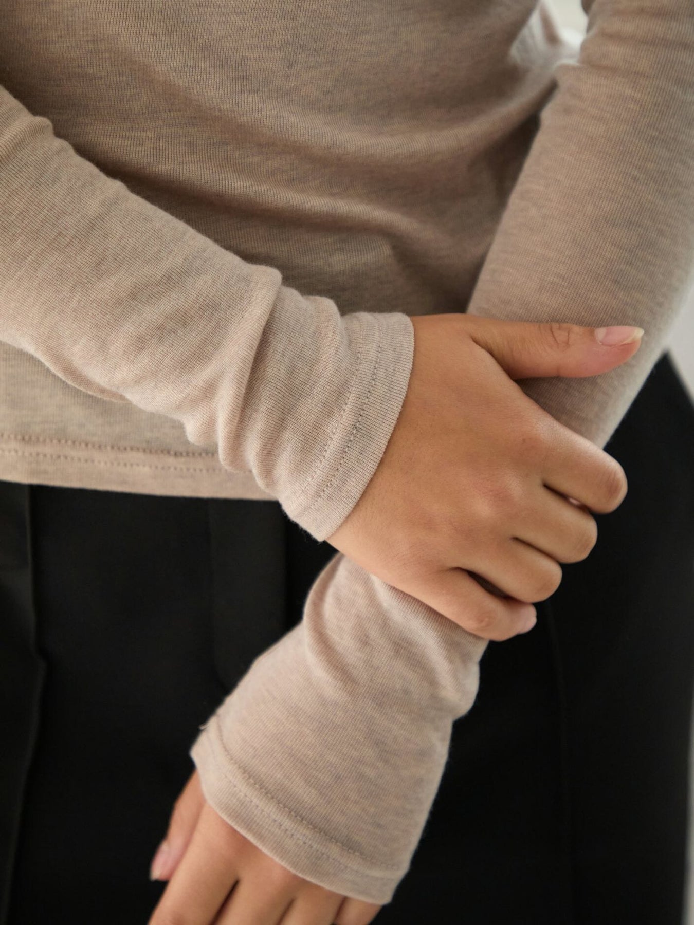 Beige melange-tröja från Neo Noir i ribbstickat material. En kroppsnära tröja med rund halsringning och långa ärmar i en neutral färg som matchar många andra färger.