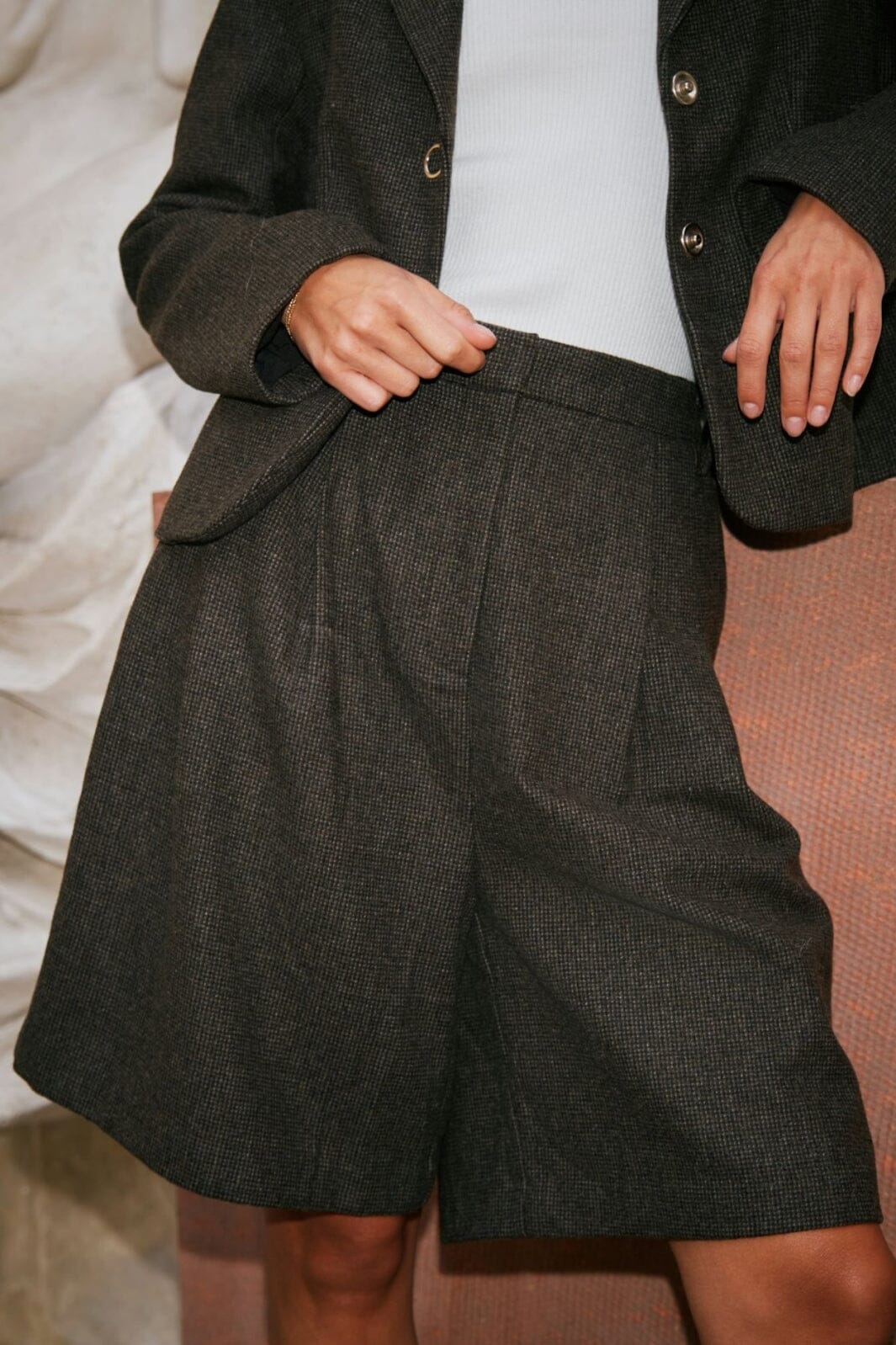 Bruna rutiga shorts från Neo Noir med hög midja och breda veck. Shortsen har en lös passform och knälängd, vilket gör dem lätta att styla för olika tillfällen.