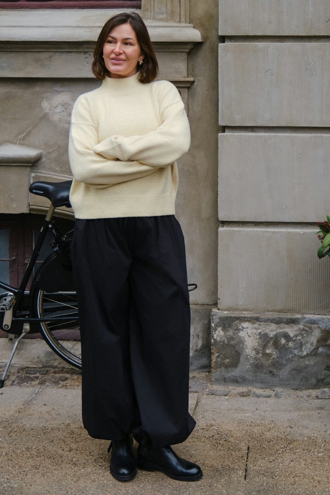Smörgul stickad blus från Neo Noir med hög hals och långa ärmar. Blusen har en lös passform och är tillverkad av en blandning av polyester, akryl, ull och elastan.