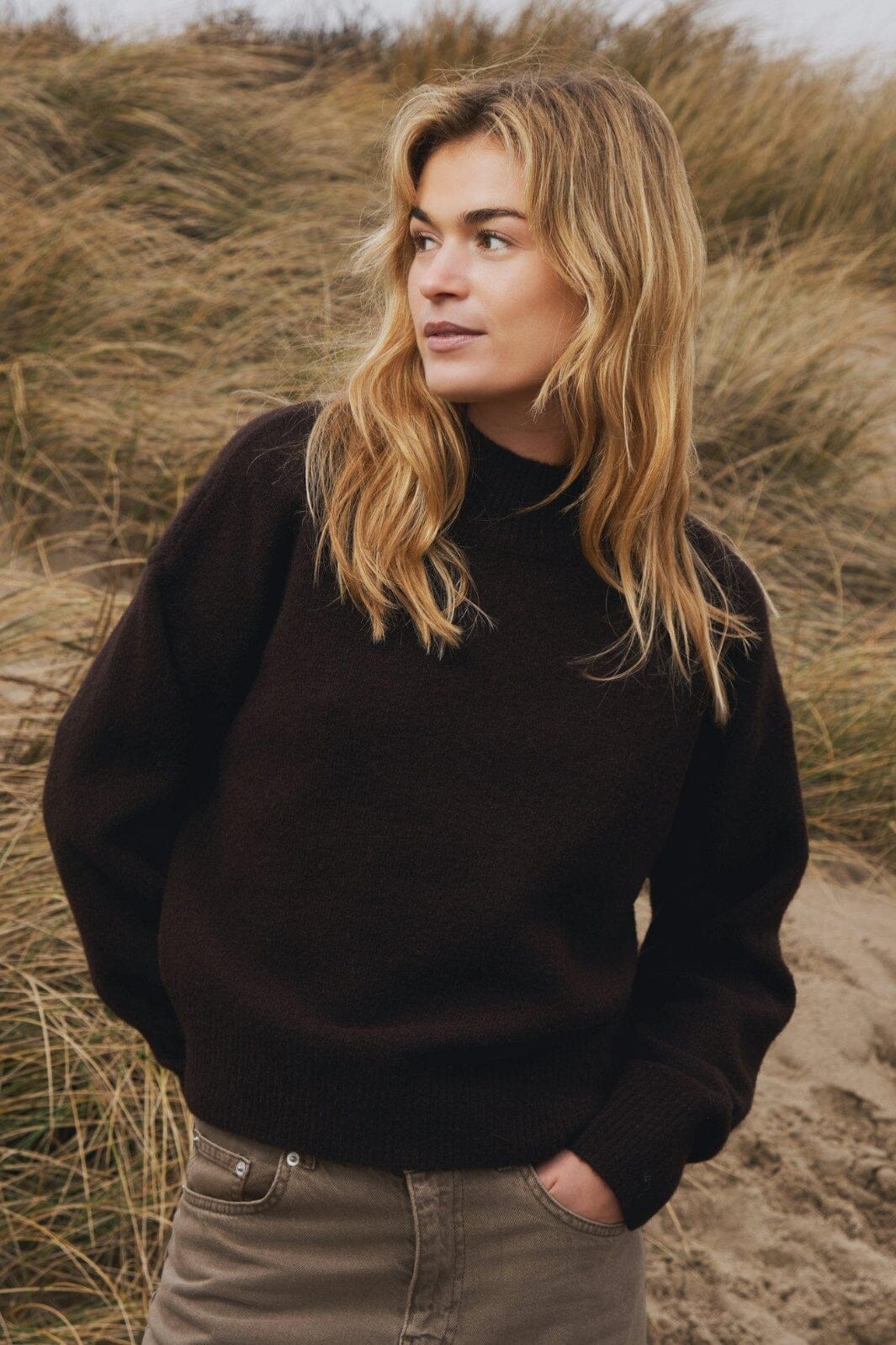 Stickad tröja med liten krage. Passformen är lös och boxig, och kvaliteten är mjuk.