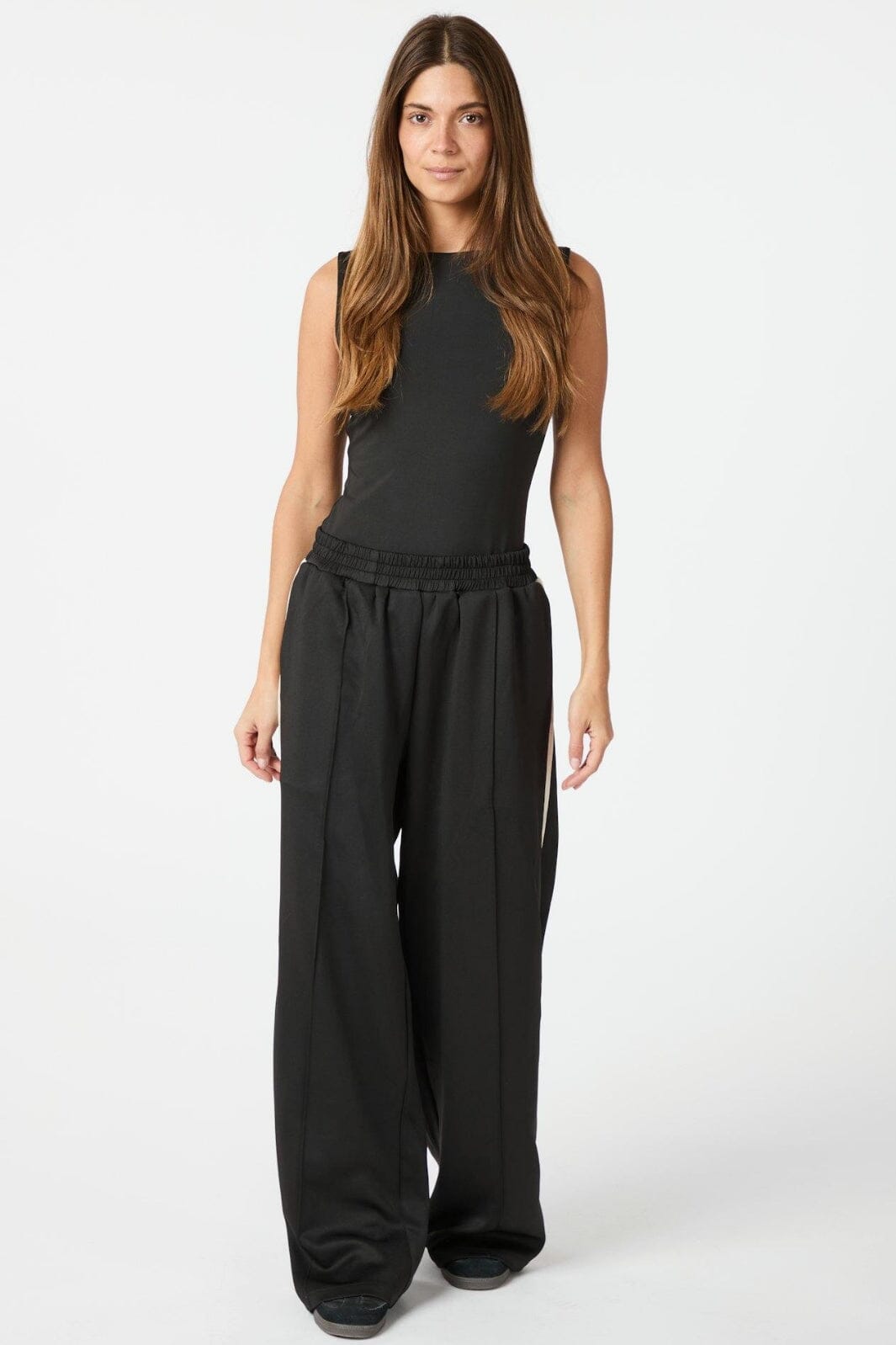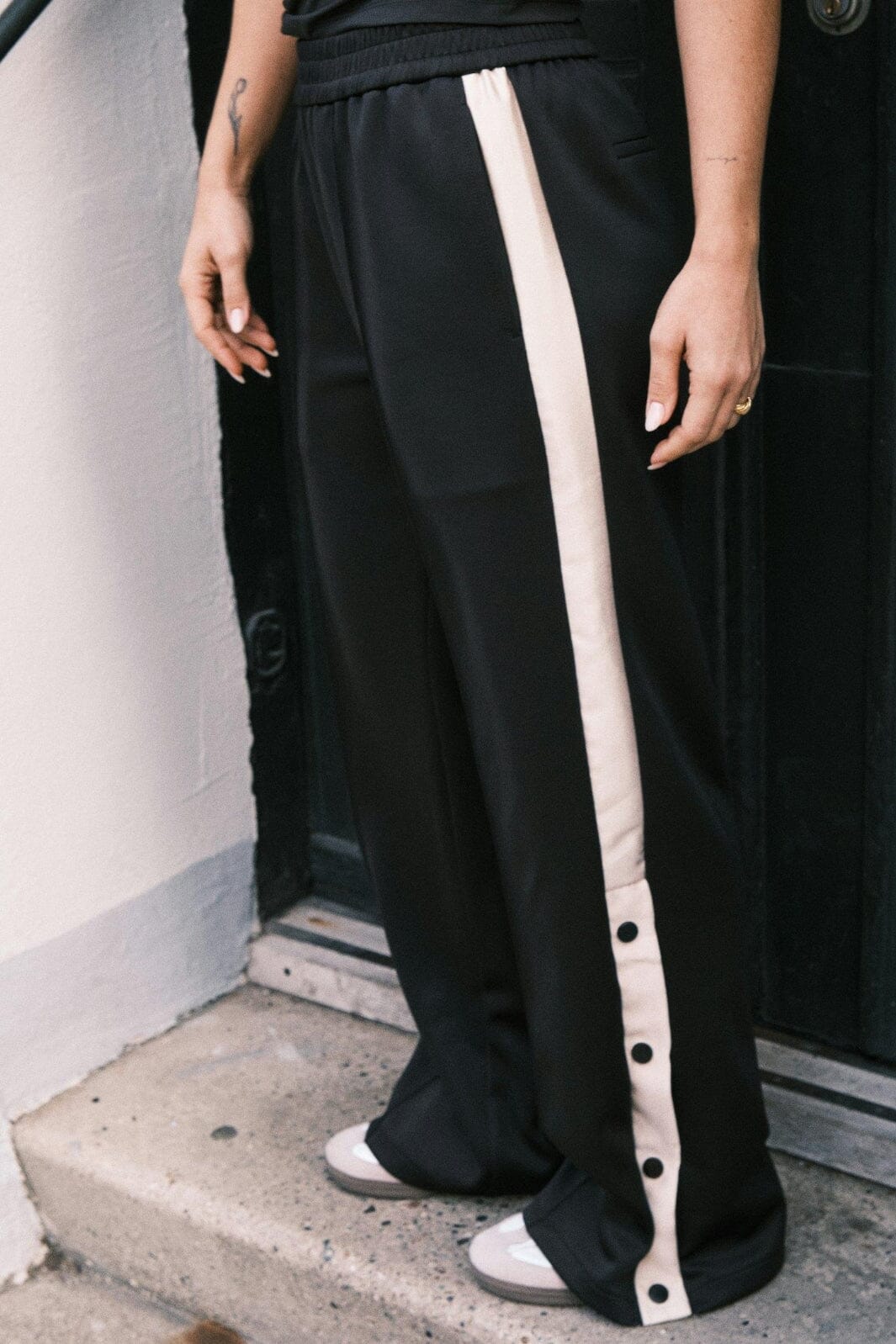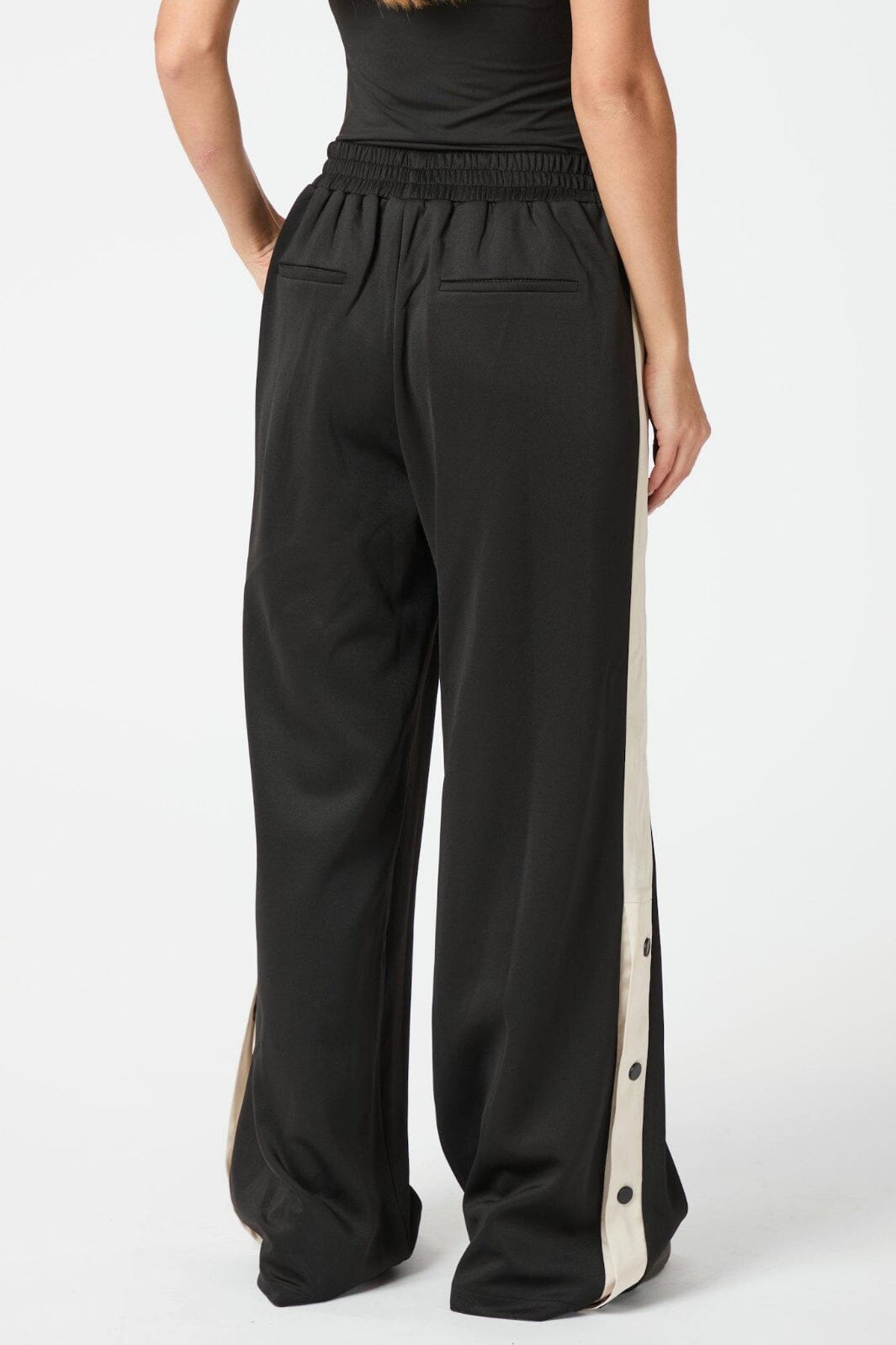 Svarta tracksuitbyxor från Neo Noir i golvlängd. Byxorna har en lös passform med randdetaljer längs benen och knappar vid slitsen.
