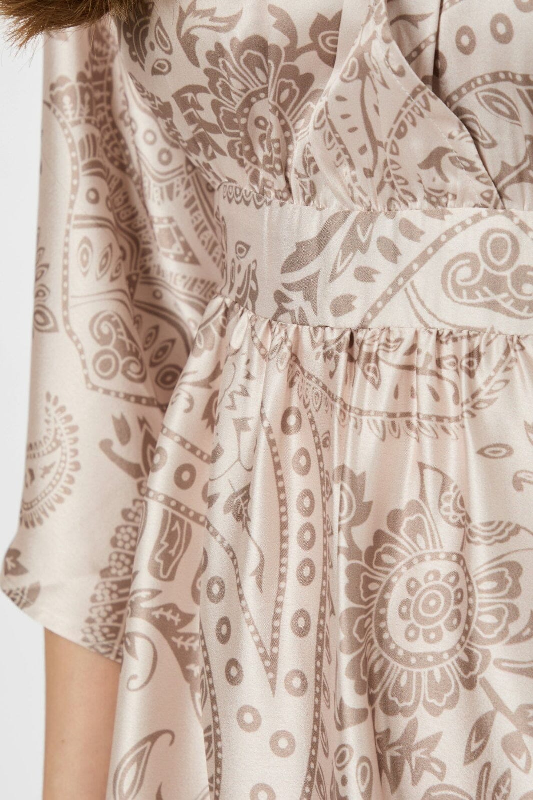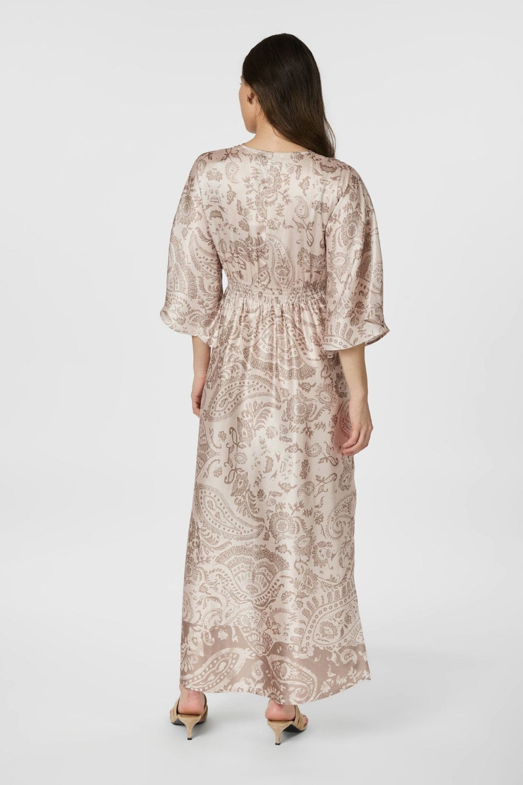 Lång klänning från Neo Noir i beige med paisleymönster. Klänningen har v-ringning och 3/4-ärmar. Den lösa passformen med elastik i midjan ger god rörelsefrihet.