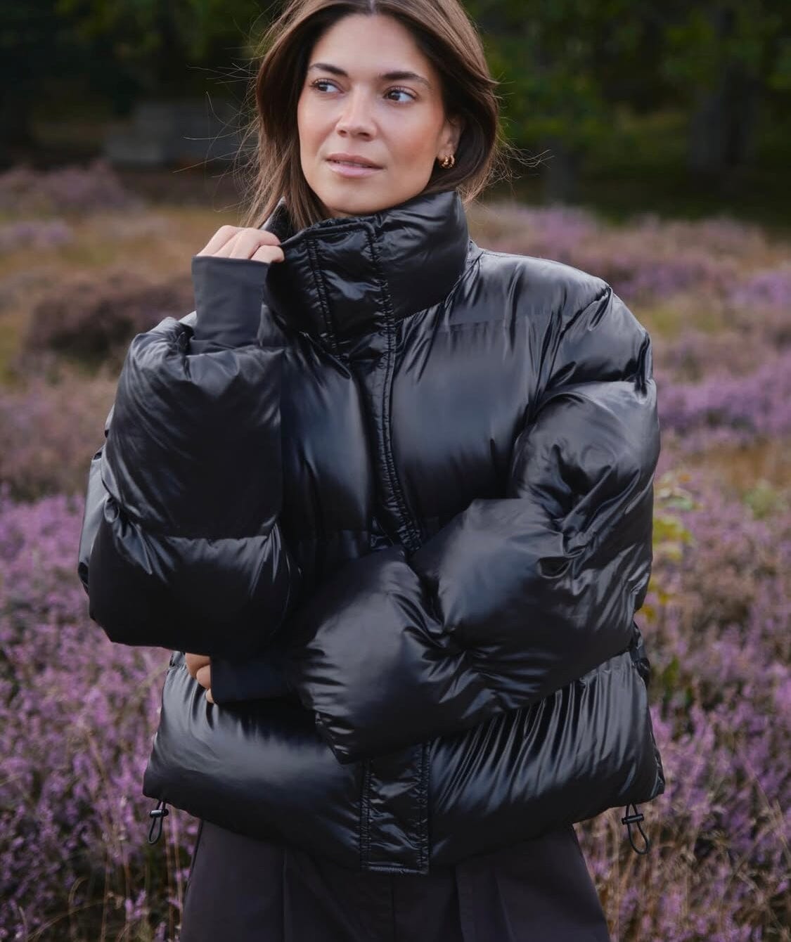 Cool vadderad jacka i en mjuk och glansig kvalitet. Jackan är kort och har justerbar vidd nedtill. Modellen är 176cm och bär storlek 36.