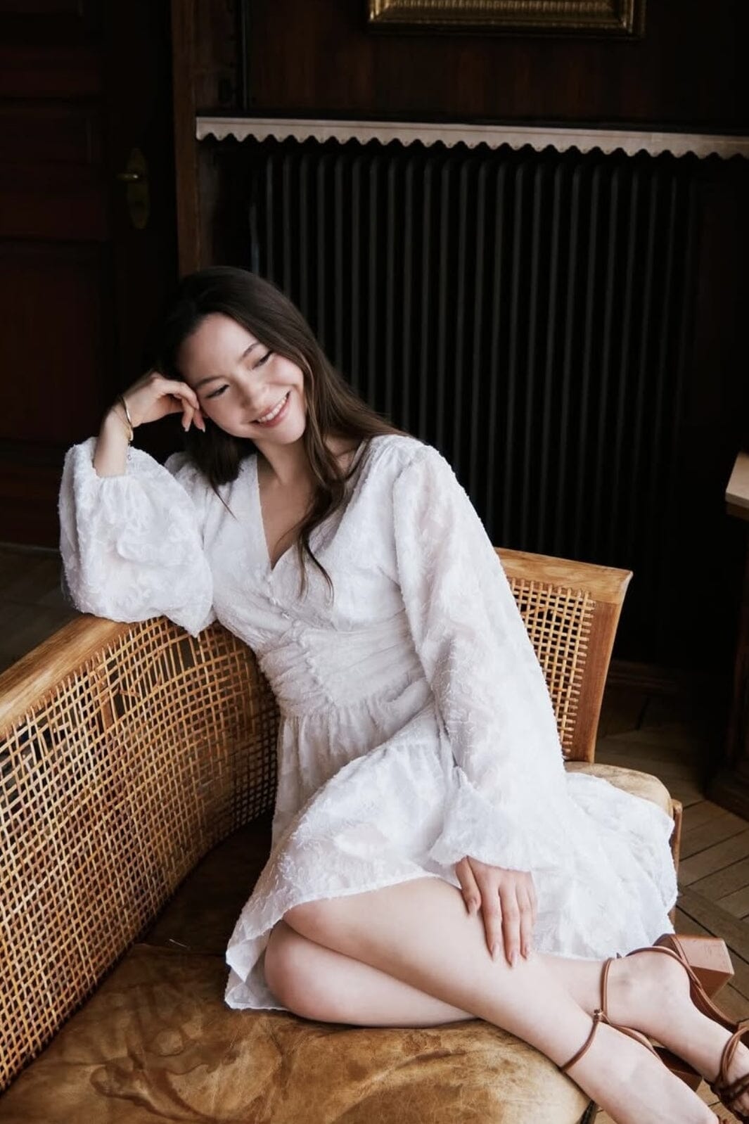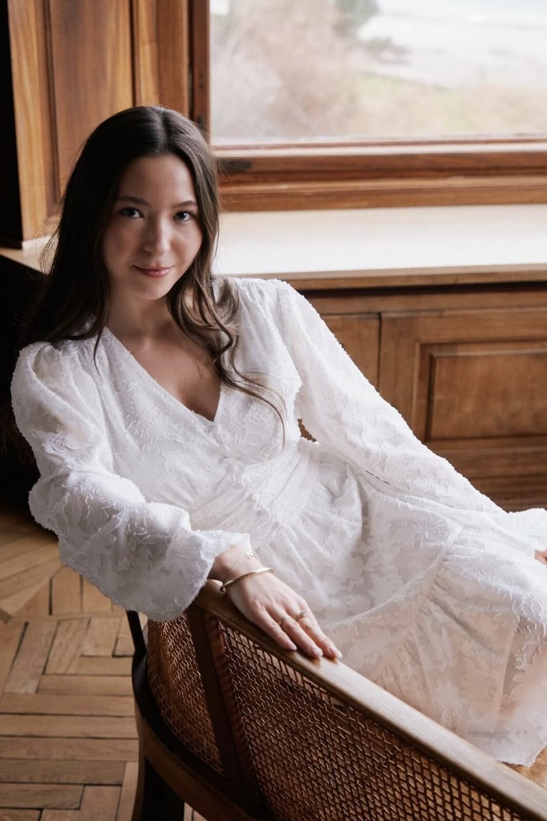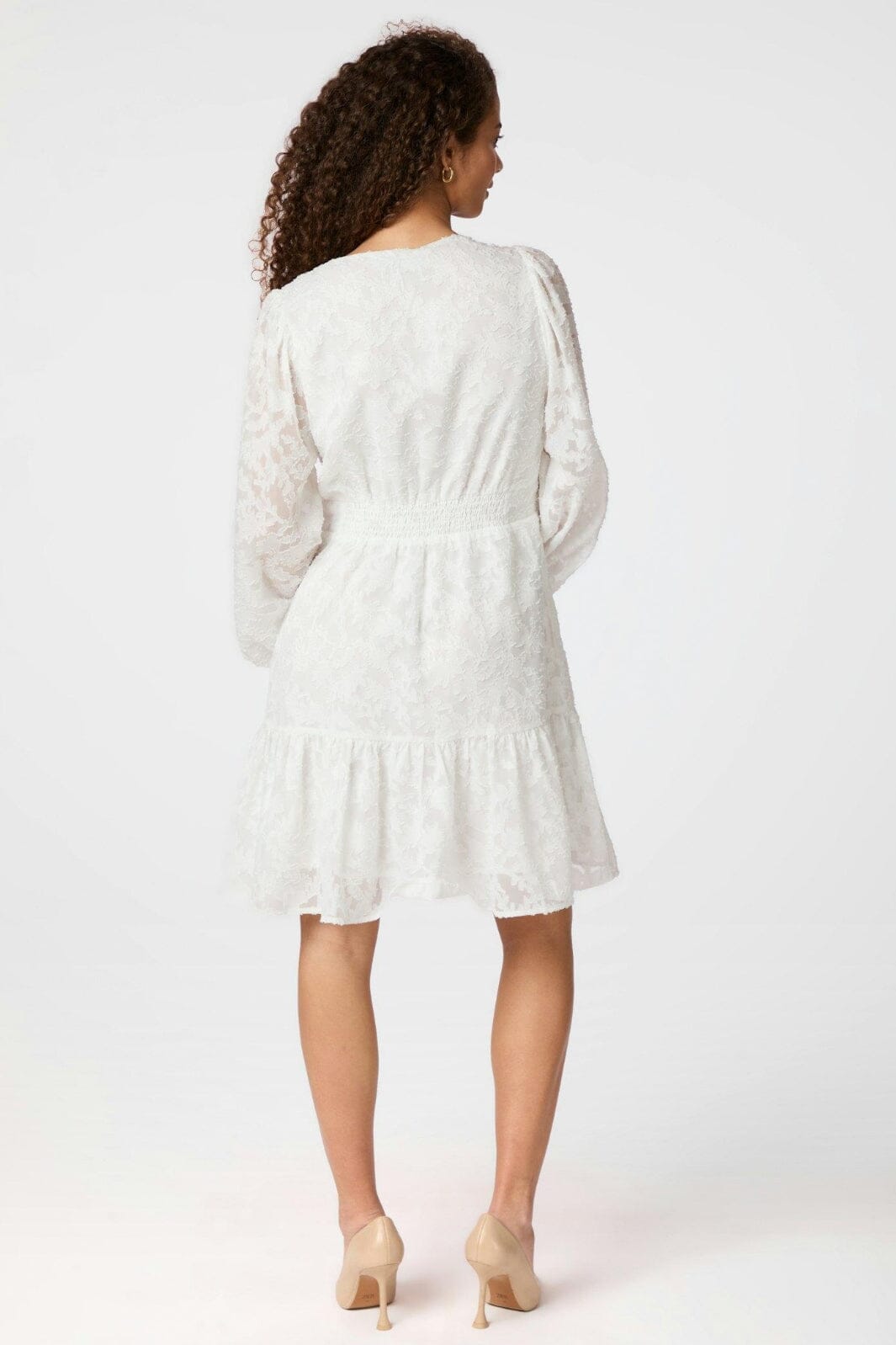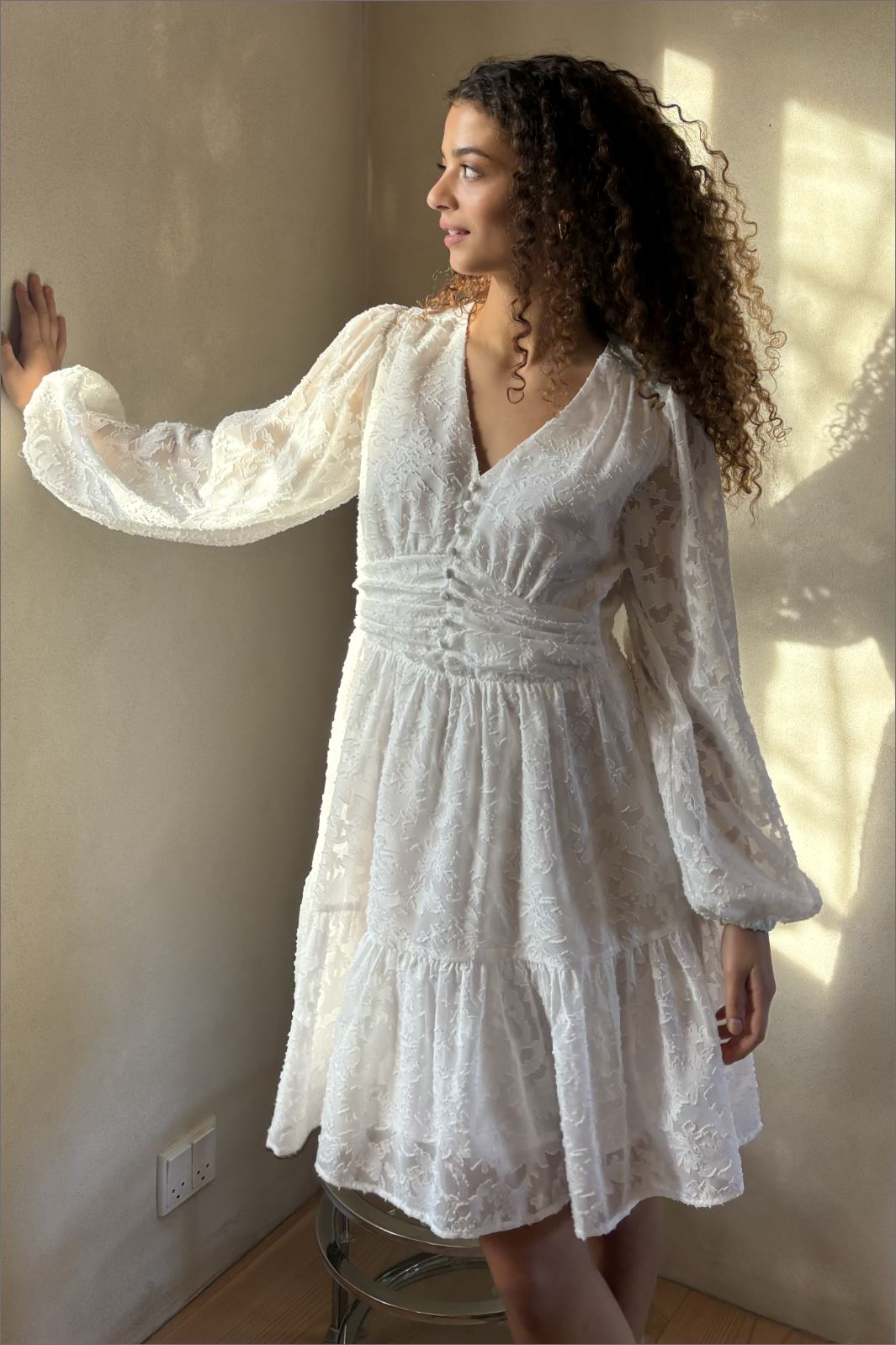 Vit klänning från Neo Noir med ett mönster av slitna områden. Klänningen har v-ringning med knäppning och långa puffärmar som ger den en romantisk känsla.