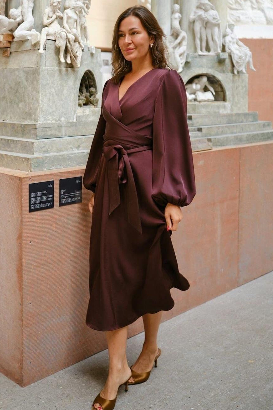 Satin klänning från Neo Noir i mörk rosa. Klänningen har en V-ringning, långa ärmar med samlade handled och en omslagsdesign med knytband i midjan.