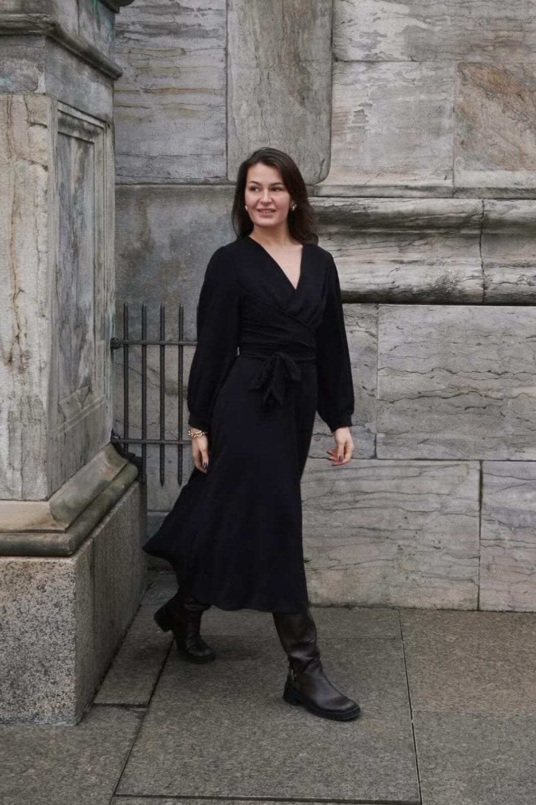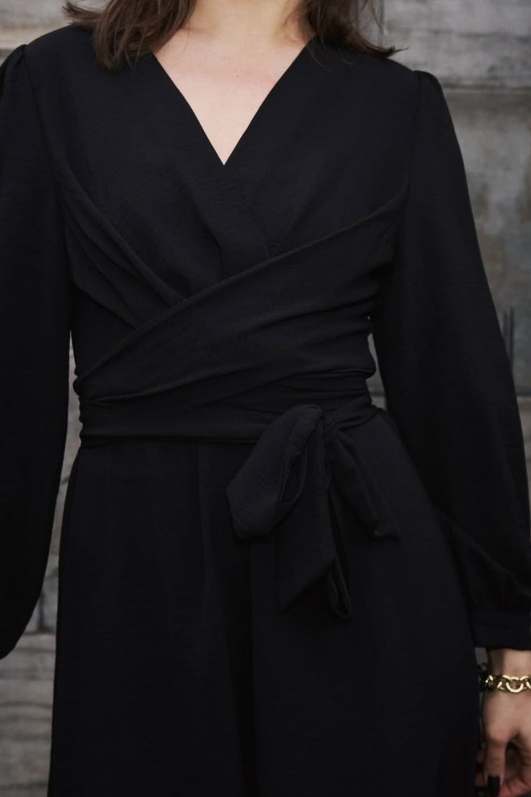 Svart klänning från Neo Noir med omslagsdesign och V-ringning. Klänningen har långa puffärmar och ett knytband i midjan som skapar en anpassad silhuett.