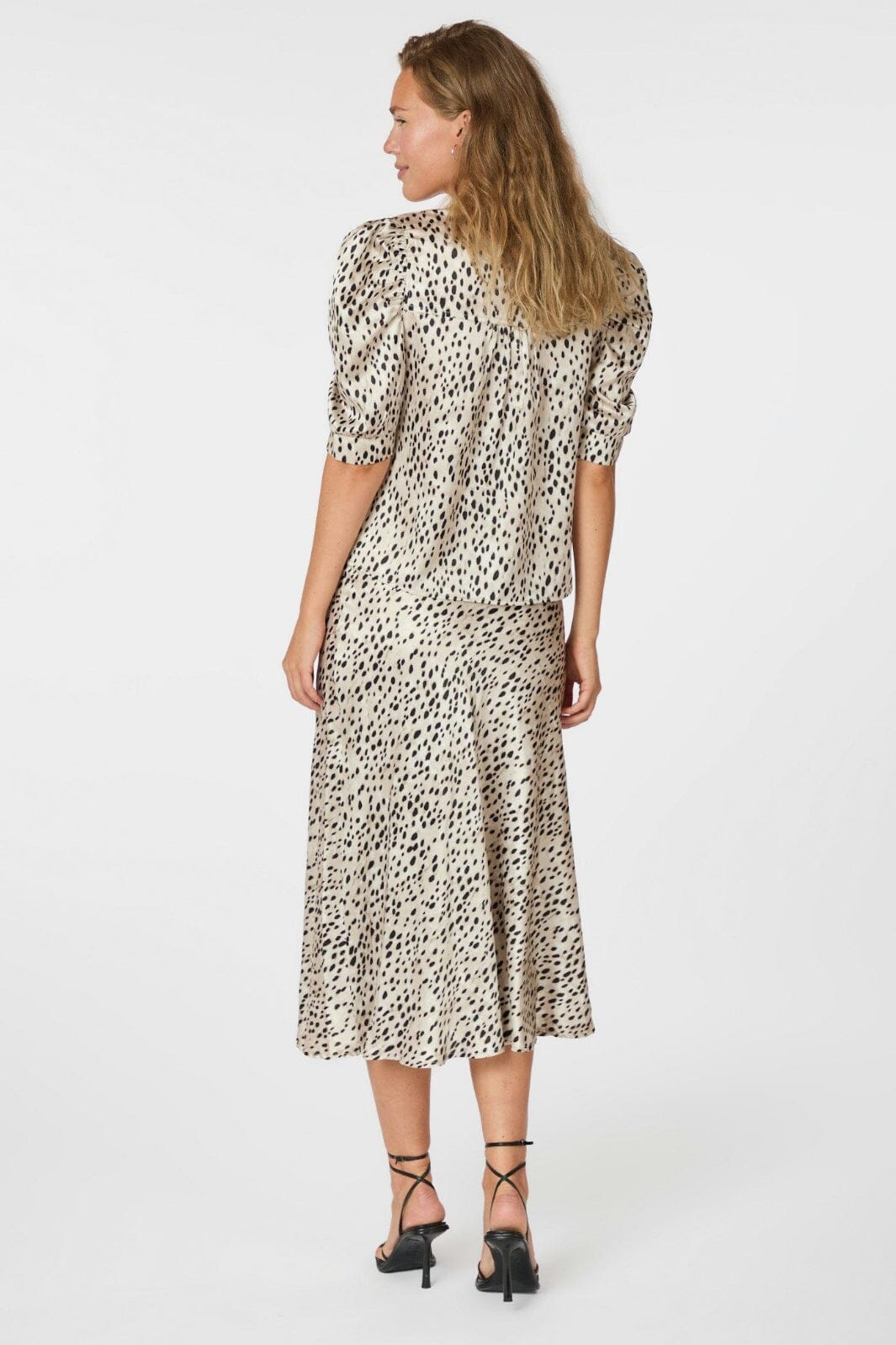 Blus från Neo Noir i elfenbensfärgad polyester med svart prickmönster. Designen har puffärmar med rynkdetaljer och en v-ringning med volanger.