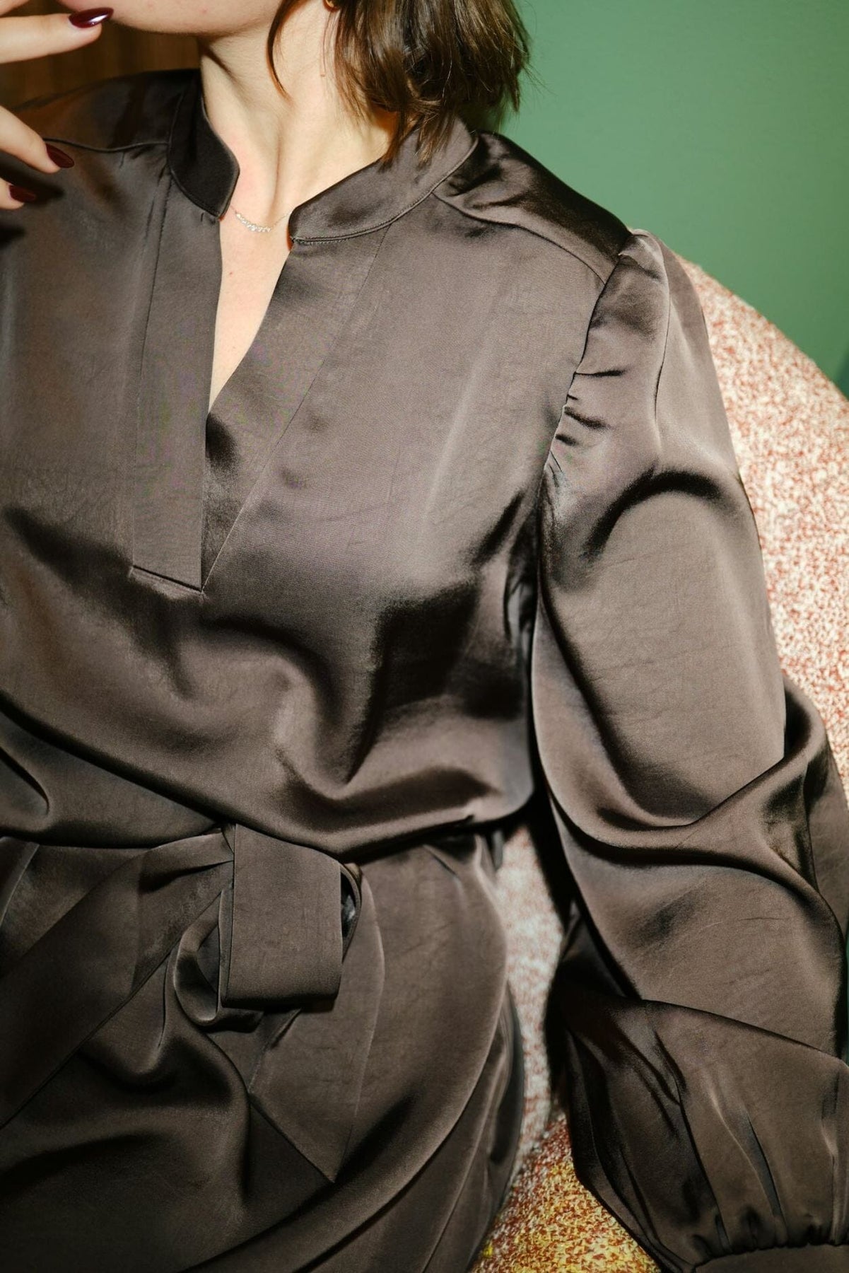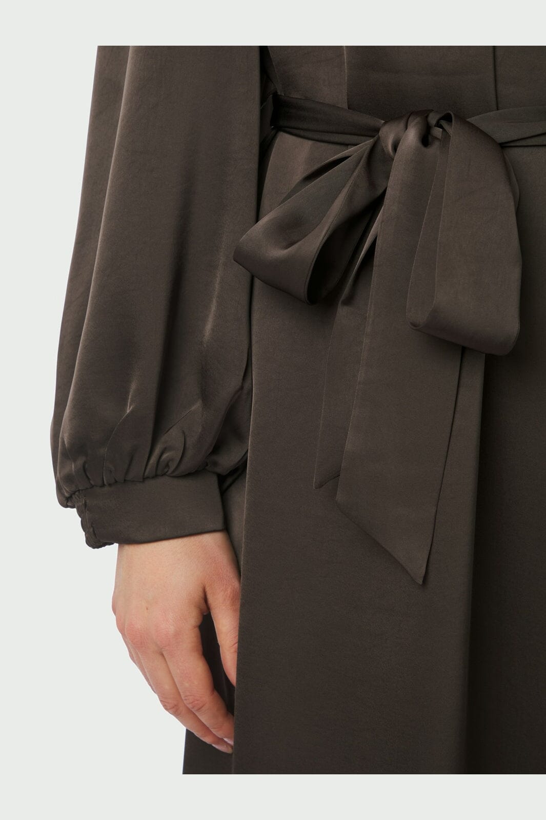 Mörkbrun satinklänning från Neo Noir med långa ärmar och manschetter. Klänningen har en V-ringning och ett knytbälte i midjan som kan justeras efter önskemål.