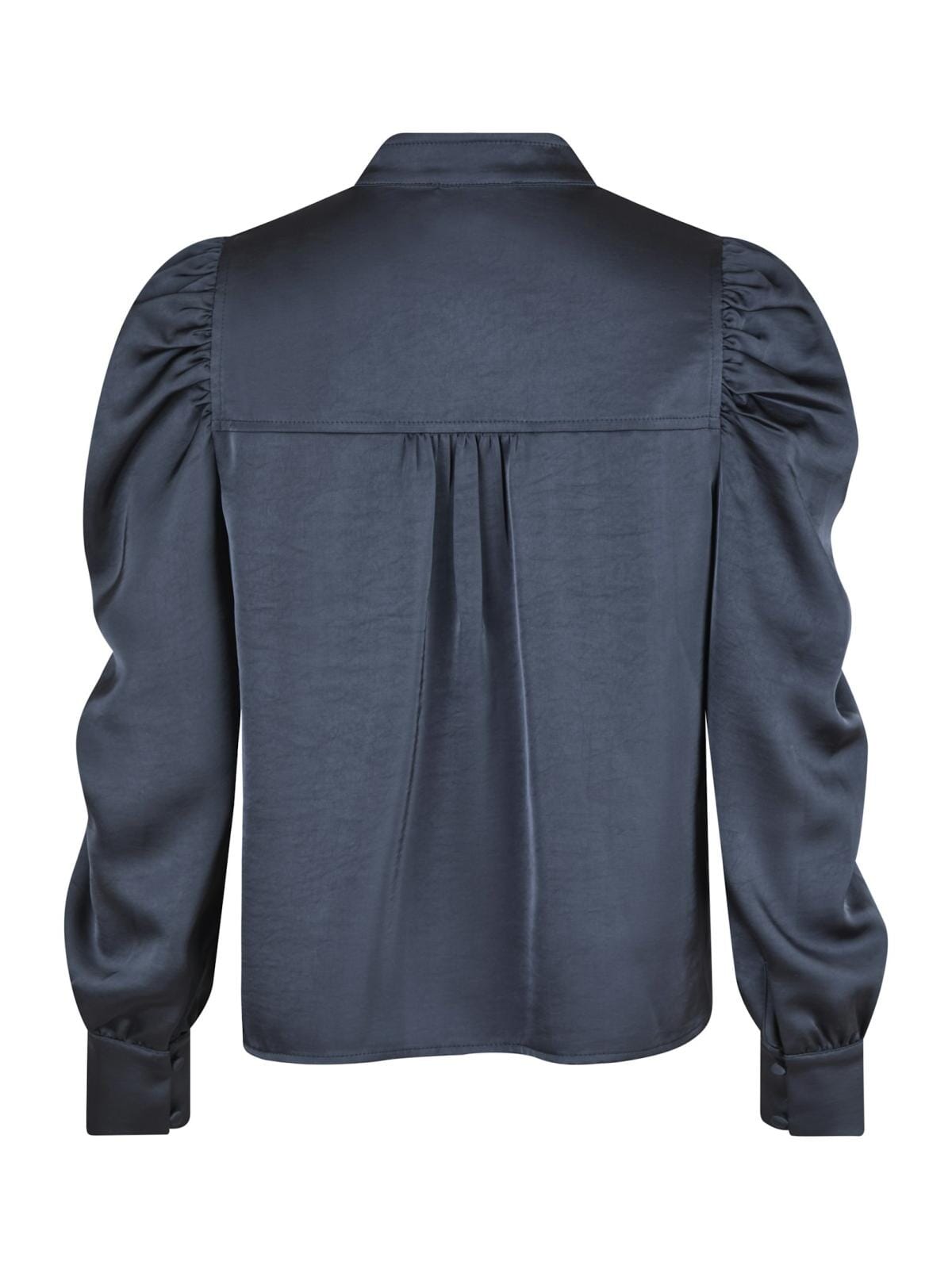 Mörkblå blus från Neo Noir i tung sateen. Blusen har puffärmar och v-ringning med volanger samt plissering på ryggen.