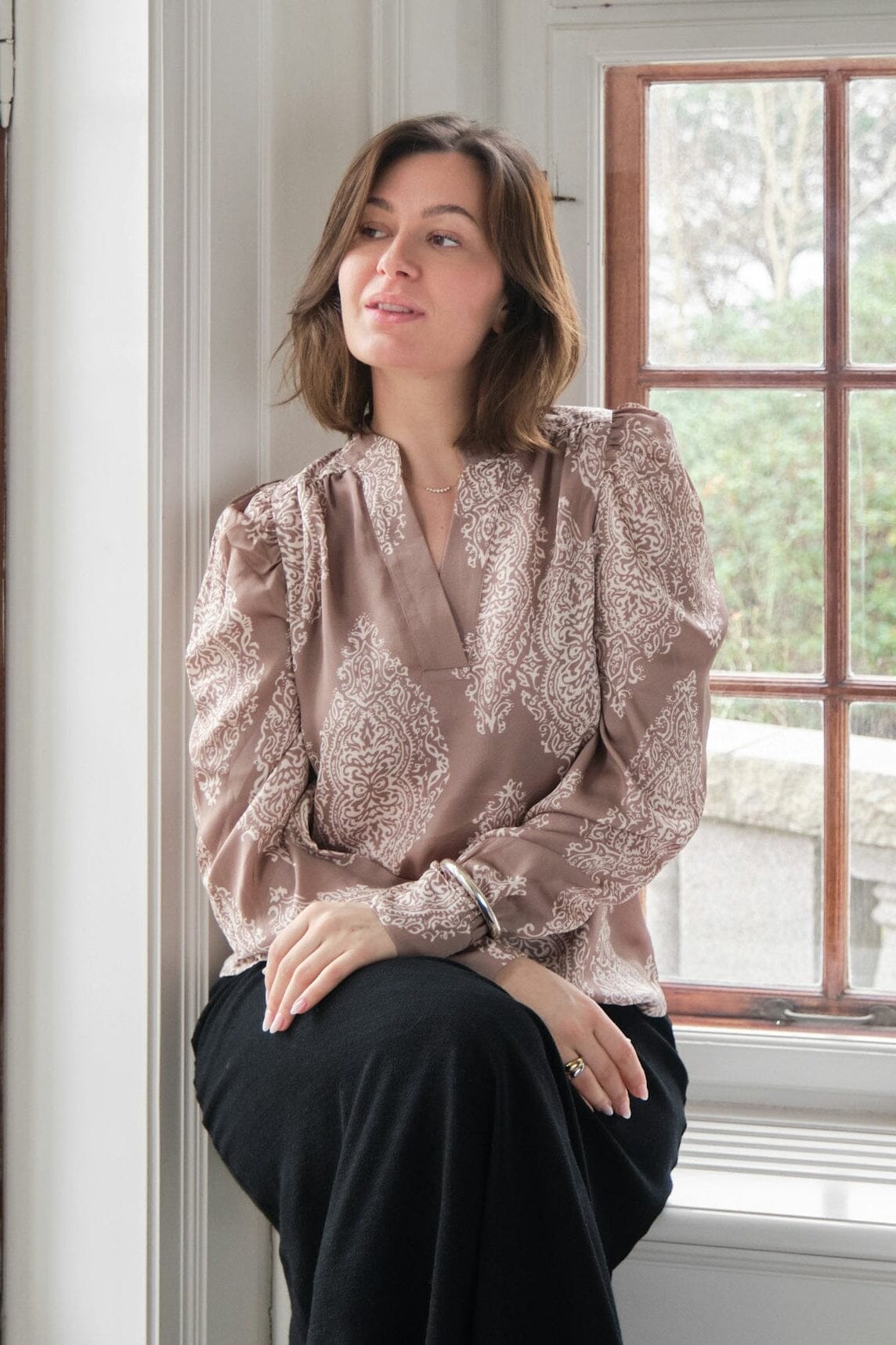 Blus från Neo Noir i mörk taupe med paisleymönster i ljus kontrast. Tillverkad av 100% polyester med satinyta.