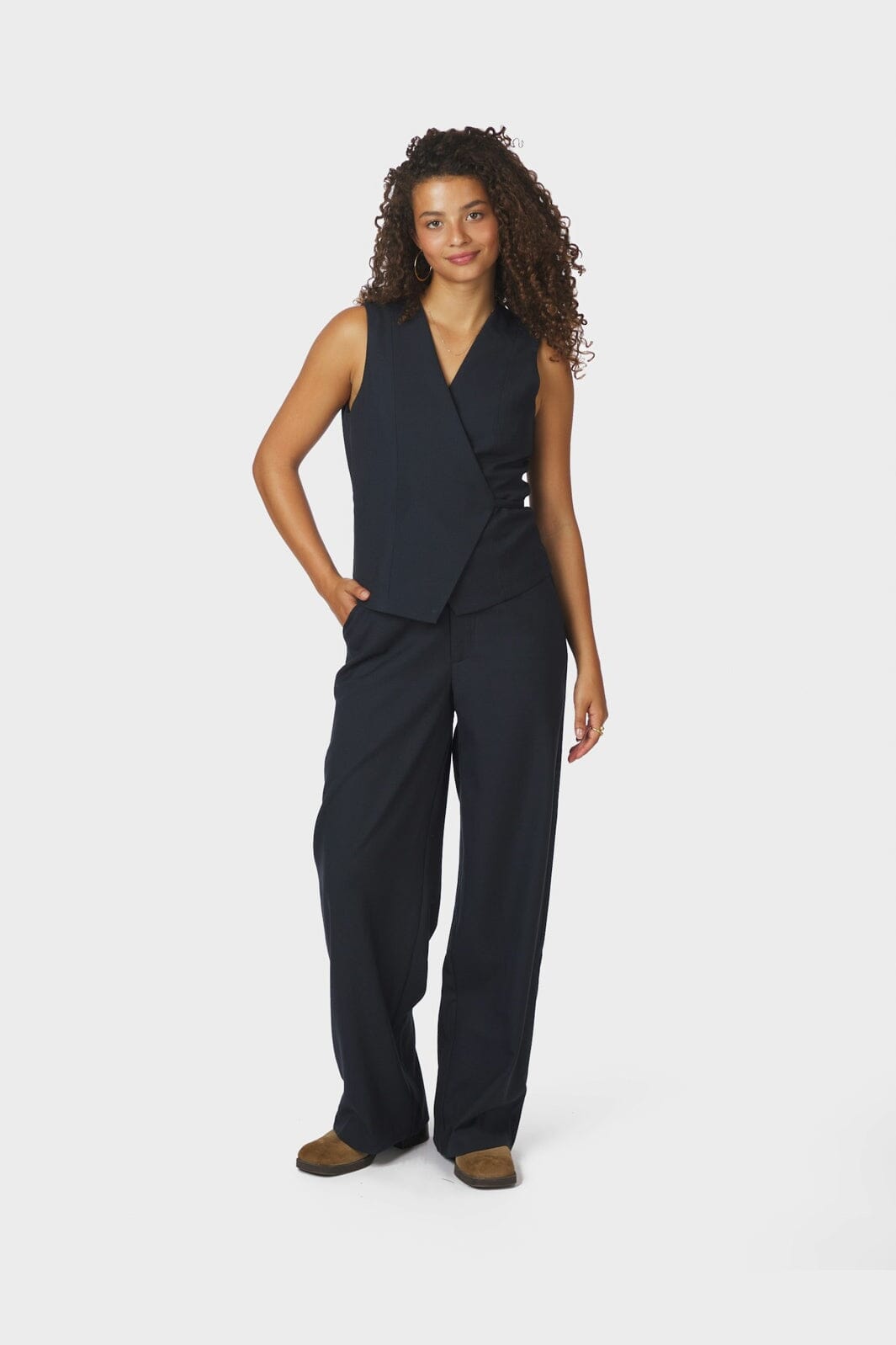 Mörkblå väst från Neo Noir med V-ringning och slim fit-passform. Den har knytband i midjan och ett melerat tyg som ger struktur till designen.