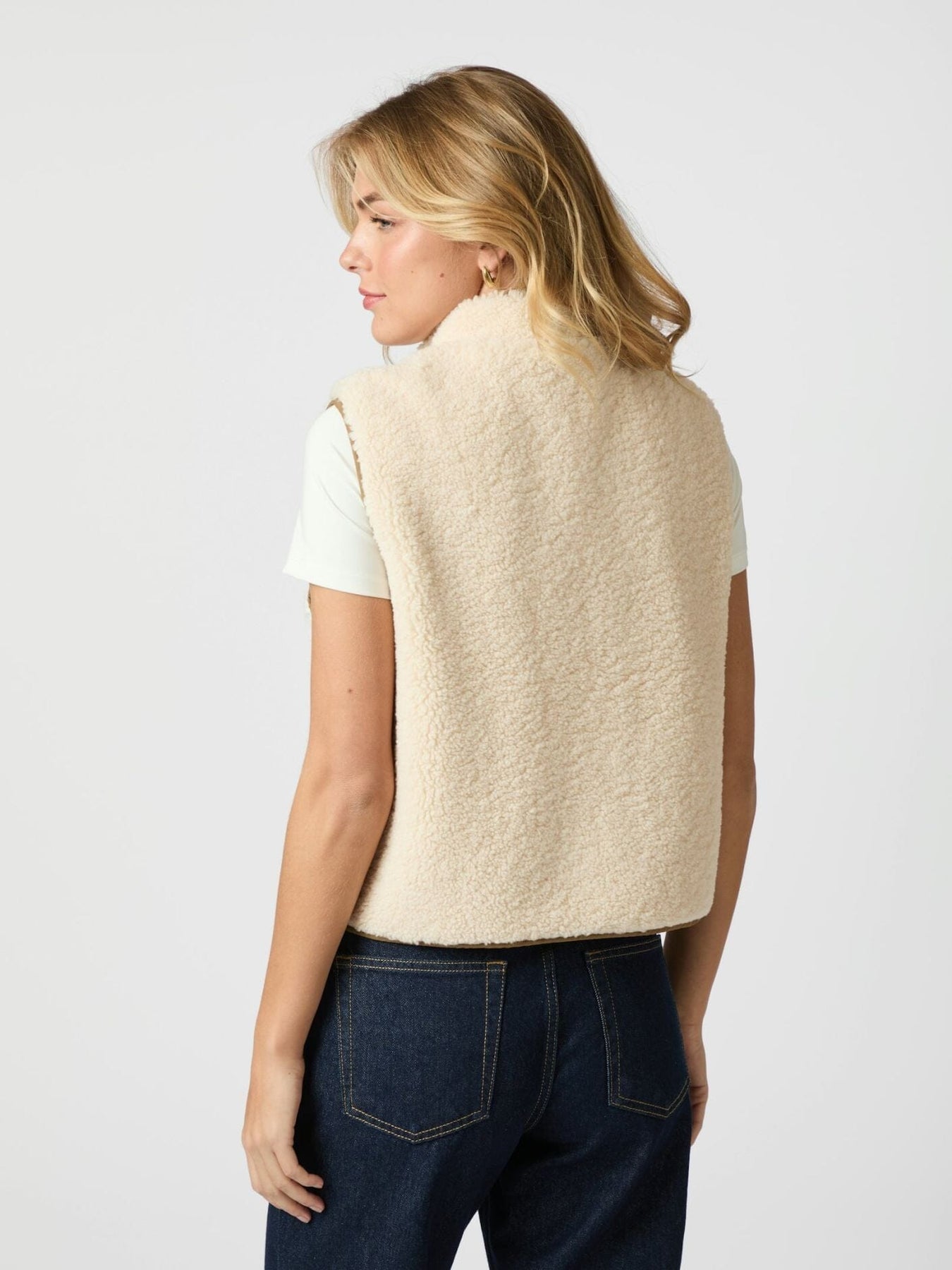 Teddyväst från Neo Noir i off-white med bruna kontraster. Den mjuka teddy-texturen kombineras med kviltade fickor och hög krage. Dragkedjan fram gör västen praktisk att använda.