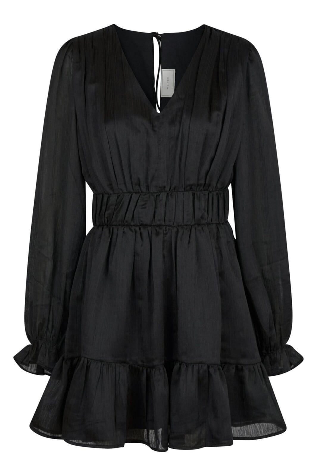 Svart klänning från Neo Noir med v-ringning och långa ärmar. Klänningen har en samlad midja med volangkant och bindband som ger den ett feminint uttryck.