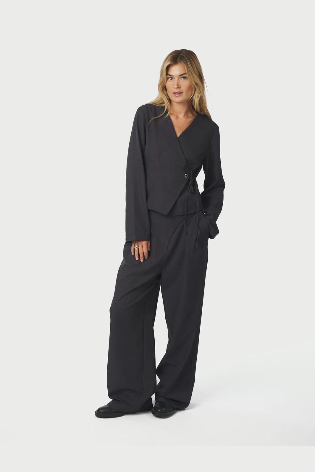 Mörkgrå blus från Neo Noir med omslagdesign. Blusen har en V-ringning och långa ärmar. En metallring och snöre i sidan ger möjlighet att justera passformen.