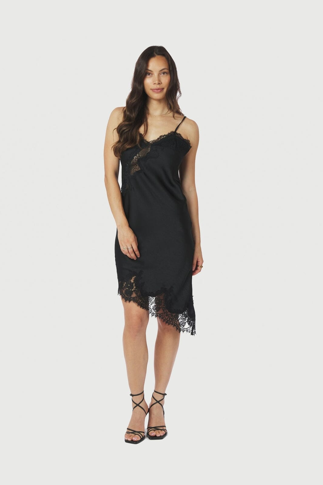 Svart spetsklänning från Neo Noir med asymmetrisk kant. Klänningen har tunna axelband och spetsdetaljer vid V-ringningen samt längs den nedre kanten.