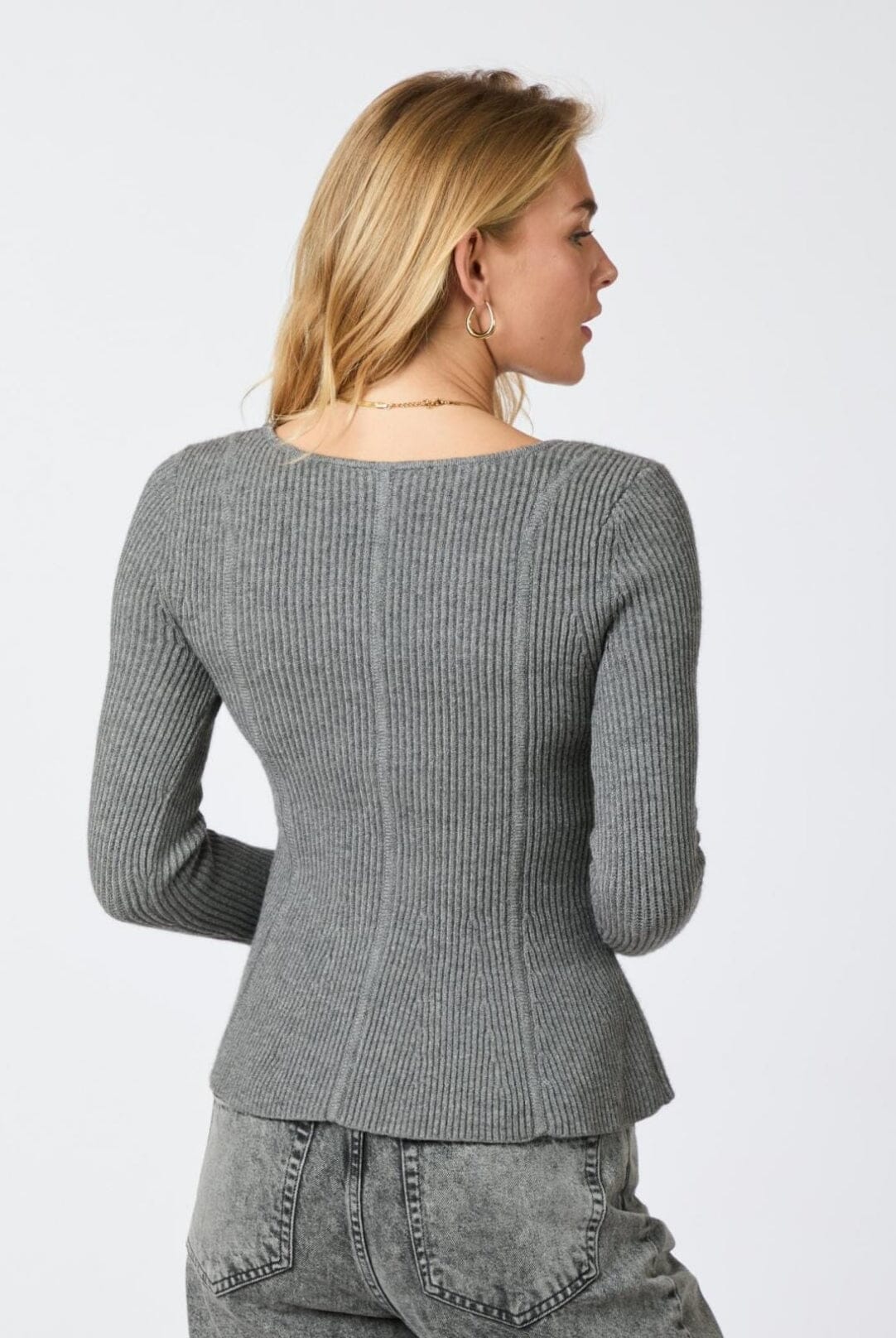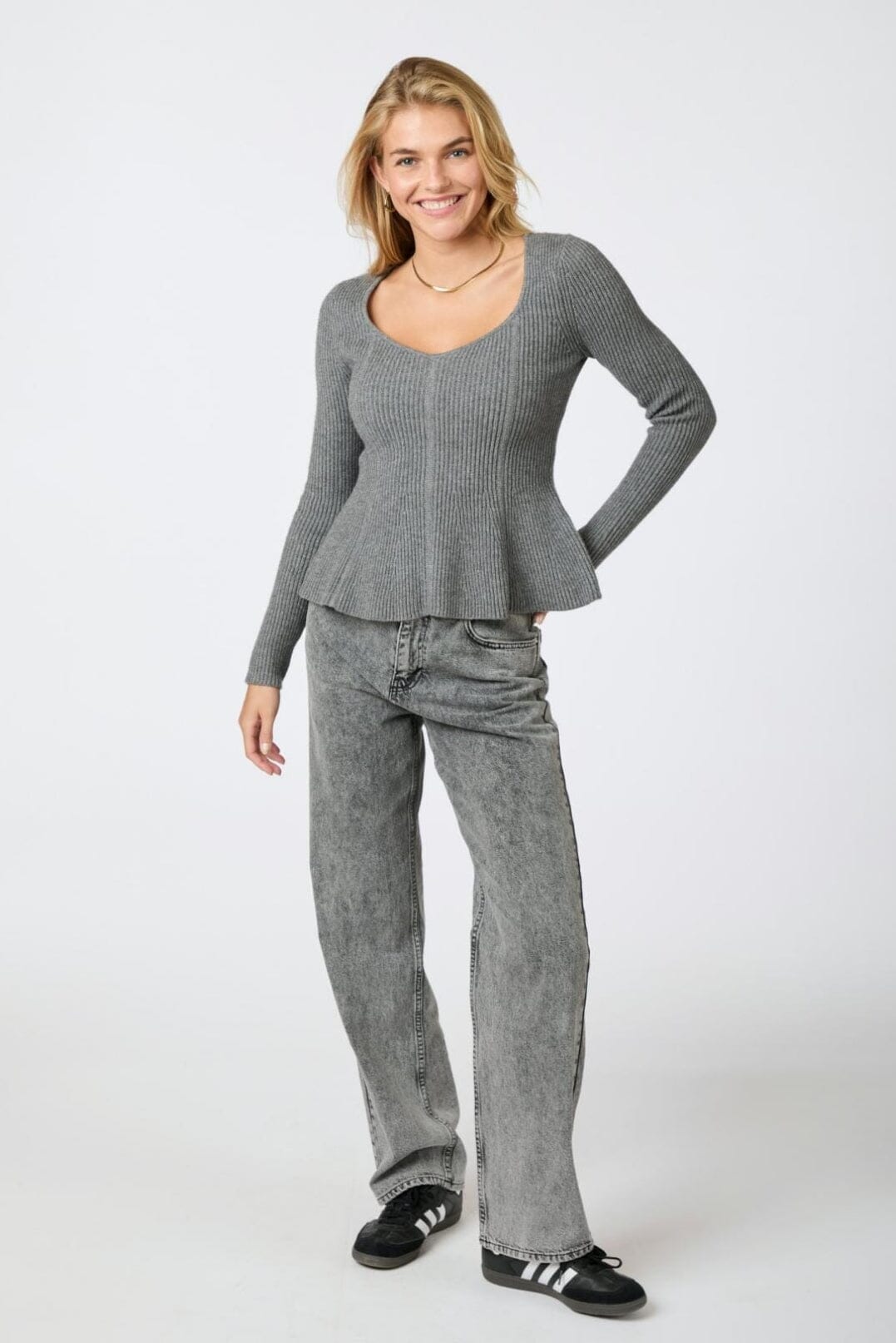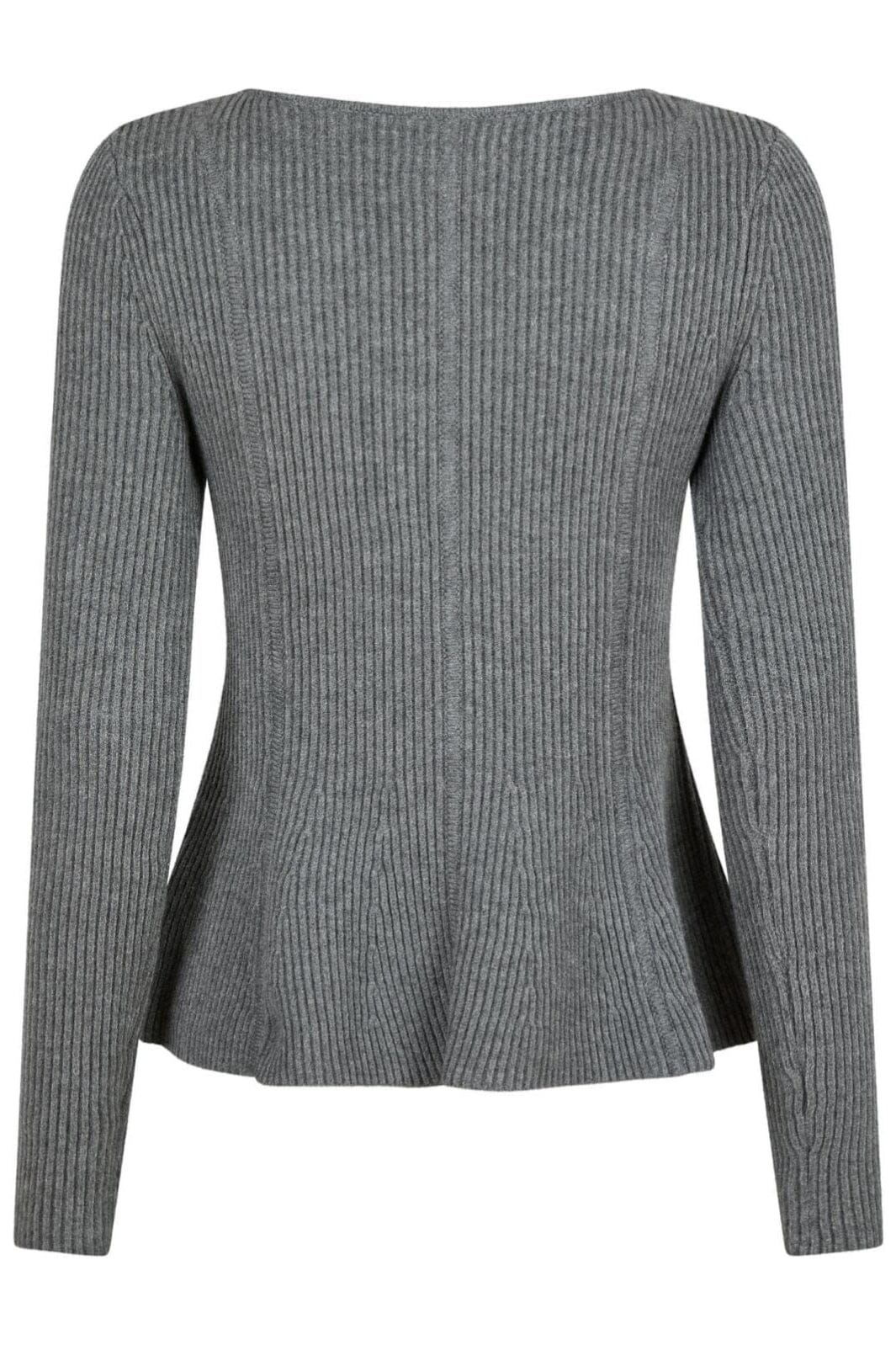 Mörkgrå stickad tröja från Neo Noir med ribbad textur. Tröjan har långa ärmar med volangdetaljer, rund halsringning och en peplum-söm vid midjan.