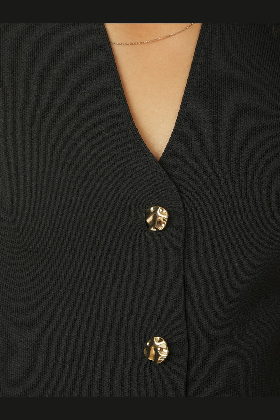 Svart stickad väst från Neo Noir med V-ringning och guldfärgade knappar. Västen har en slim fit-passform och en praktisk slitsöppning framtill som gör den enkel att justera.