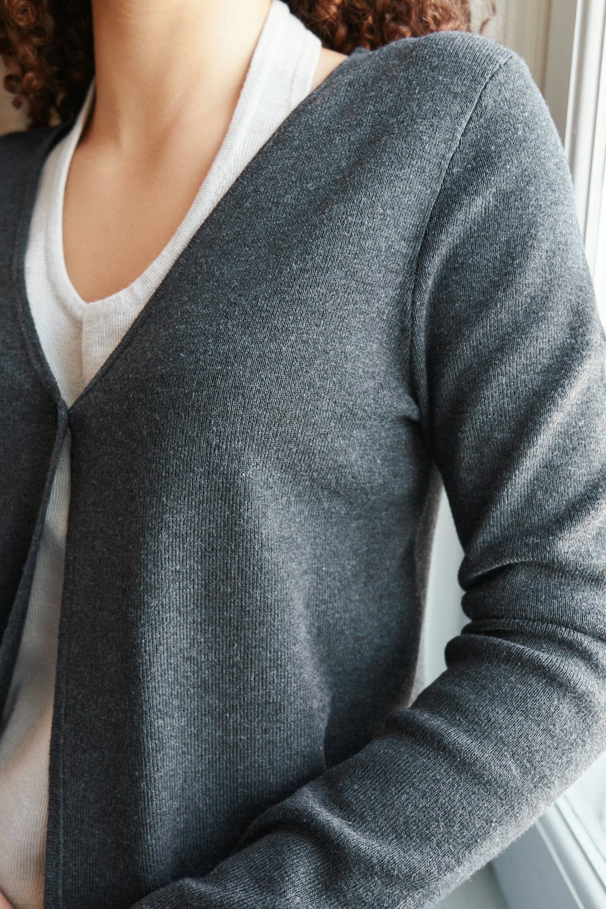 Stickad blus från Neo Noir, tillverkad av 100 % polyester i en mörkgrå nyans. Blusen har långa ärmar och en tvålagersdesign med ett kontrastfärgat innerlager.
