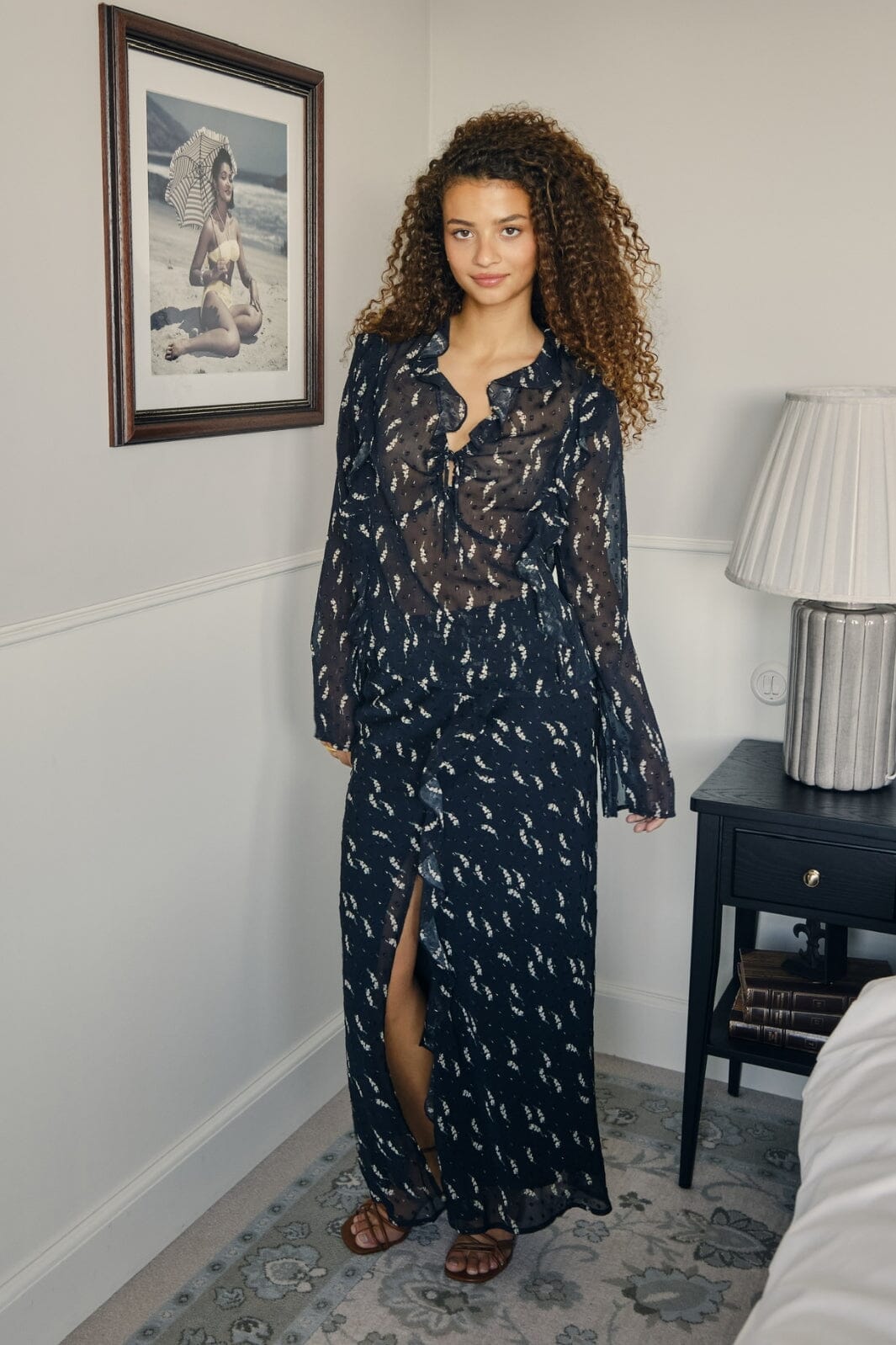 Svart kjol från Neo Noir med blommönster över hela ytan. Den har en slits på sidan och volangdetaljer fram, vilket ger en mjuk fall i tyget.