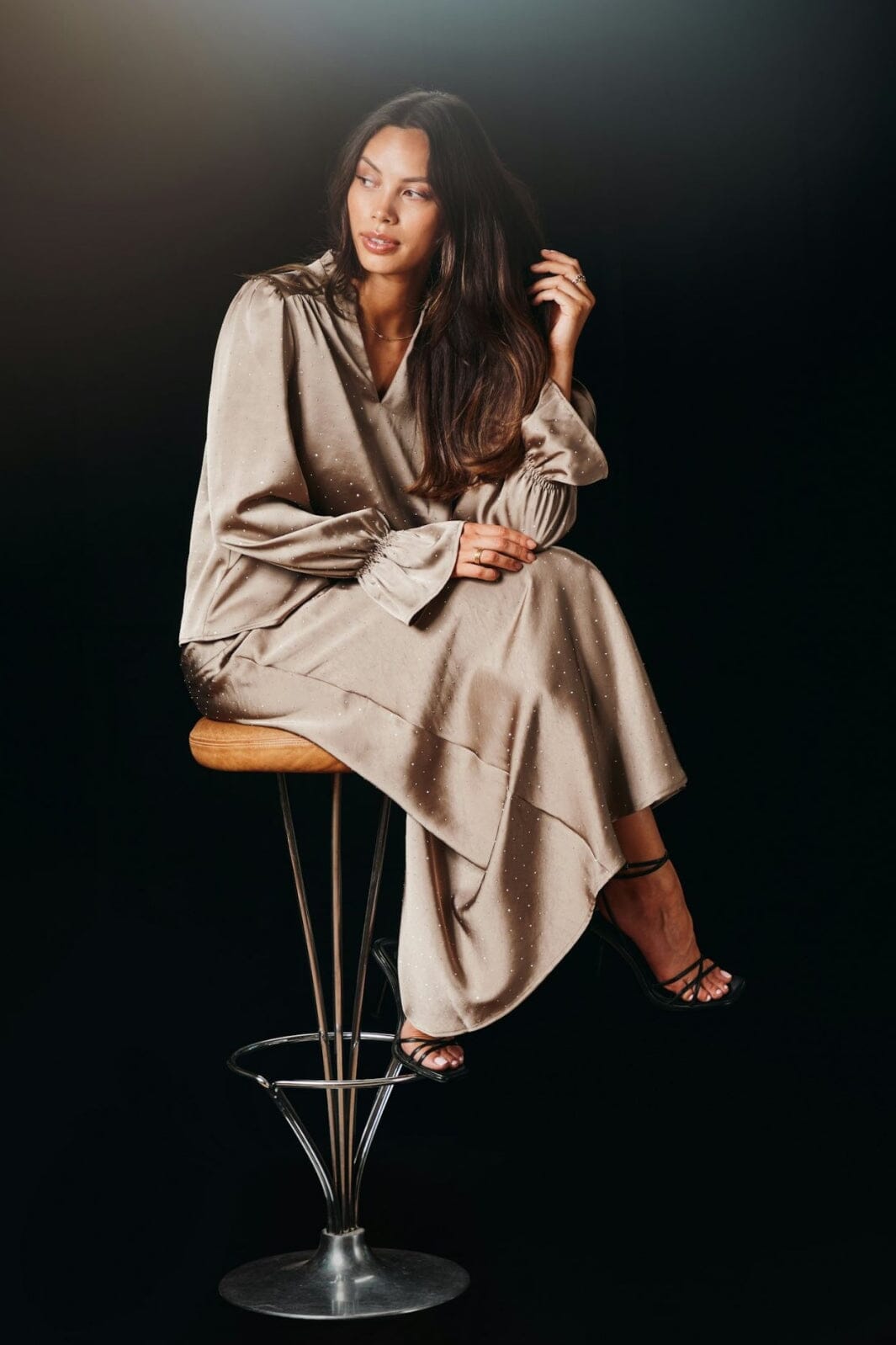 Lång kjol med resår inuti midjan. Kjolen är skuren på sned och följer kroppen och faller vackert. Kvaliteten är en härlig satin med stenar. Modellen är 176 cm och bär storlek 36.