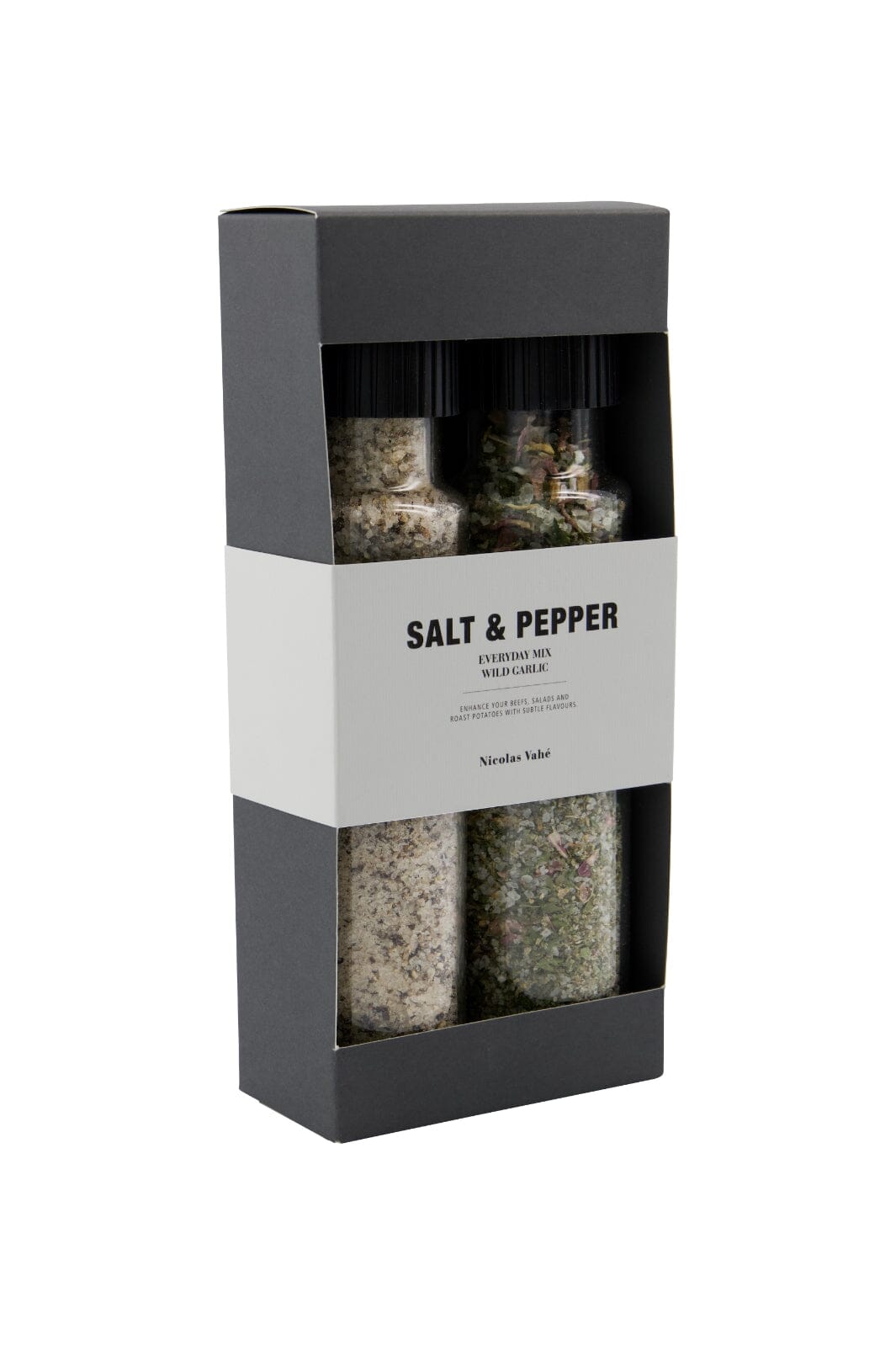 Denna presentask från Nicolas Vahé innehåller två klassiska saltblandningar för läcker matlagning. Salt- och pepparblandningen som kallas The Everyday Mix är en viktig grund för smakrika måltider. Oumbärlig på bordet. Blandningen med salt och ramslök har en ljus och fin vitlökssmak som lyfter dina biffar, stekta potatisar och dipp. Ge den som värdinnegåva eller till en vän eller granne. Alla älskar en överraskning av det kulinariska slaget.