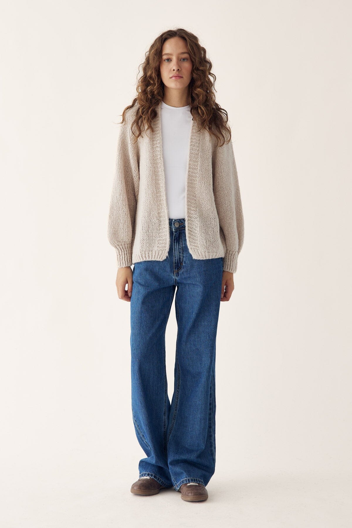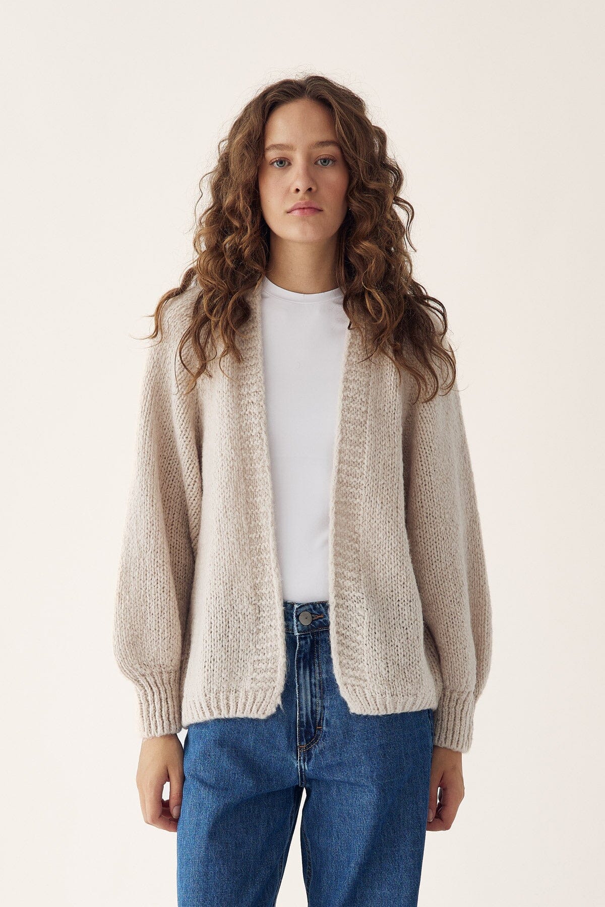 Sandfärgad cardigan från Noella med chunky stickning och V-hals. Den tjocka stickningen ger både värme och karaktär, medan den lösa passformen skapar en avslappnad silhuett.