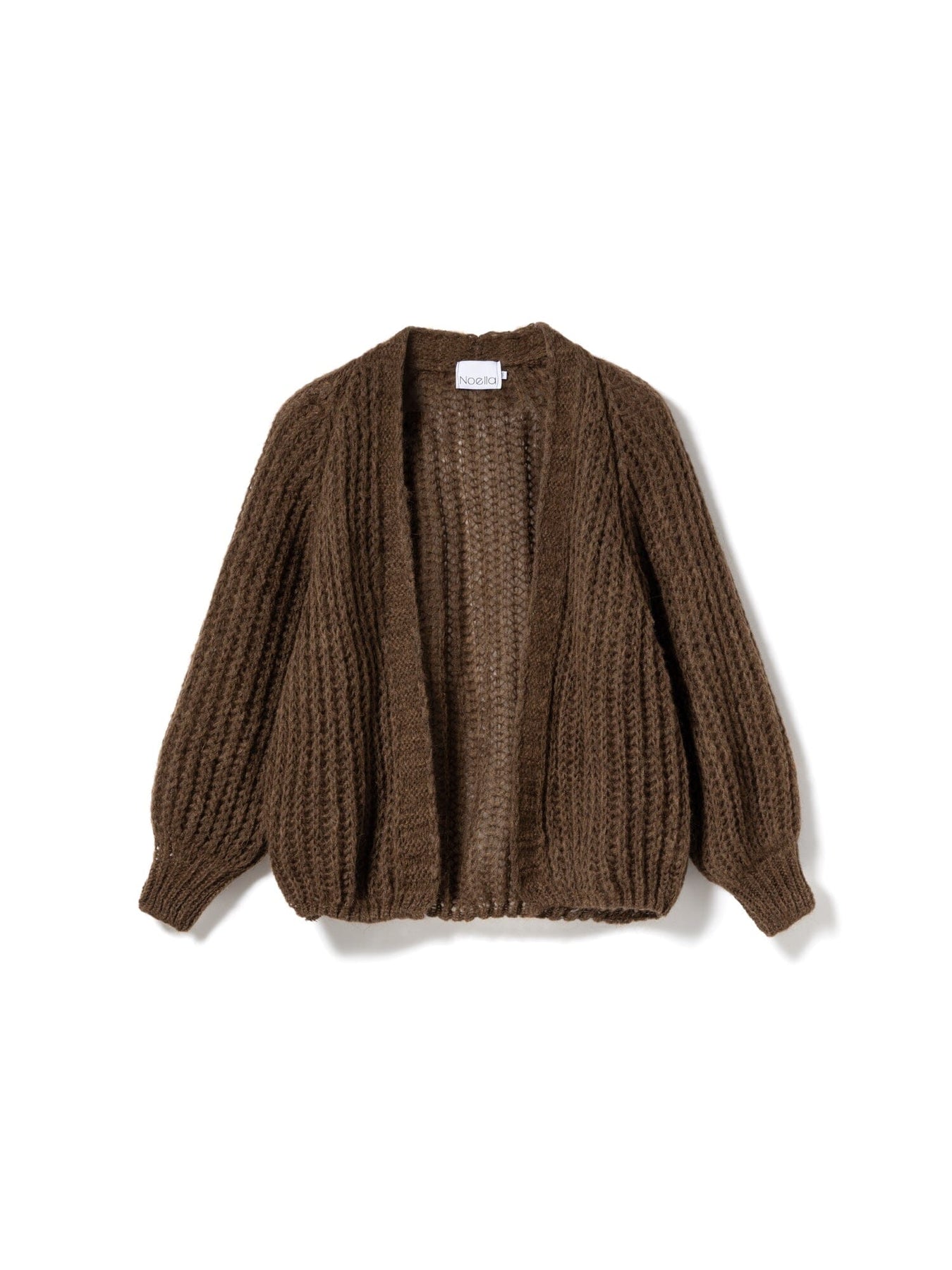 Brun stickad cardigan från Noella med öppet strukturmönster. Den lösa modellen har ballongformade ärmar och en öppen front utan knäppning. Den är stickad i en melerad chokladbrun nyans.