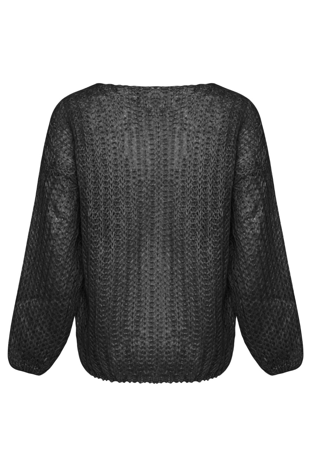 Svart stickad tröja från Noella med strukturerat stickmönster. Den lösa passformen och de långa ärmarna med ballongeffekt ger tröjan ett karaktäristiskt uttryck.