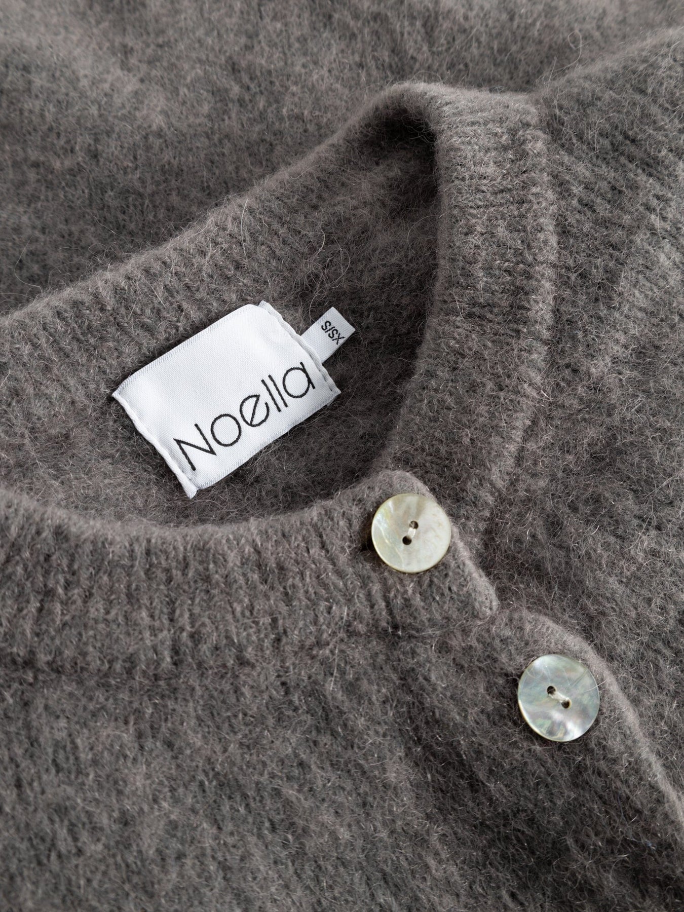 Stickad cardigan från Noella i kaffebrun. Den har rund hals, knappar fram och breda ärmar med lätt puff. Materialet är mjukt och fluffigt med en varm känsla.