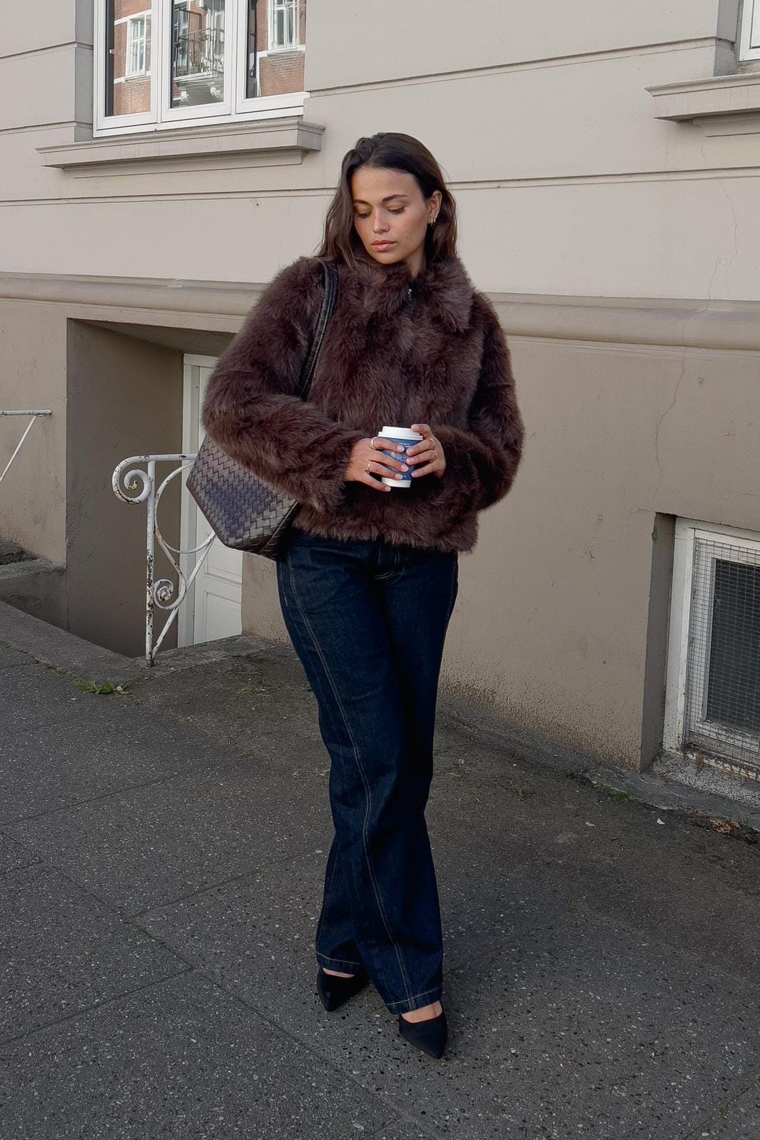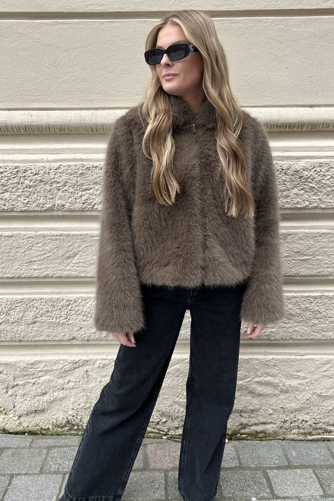 Chokladbrun jacka från Noella, tillverkad av faux päls med en fluffig textur. Jackan har en hög krage och stängs med dragkedja fram.