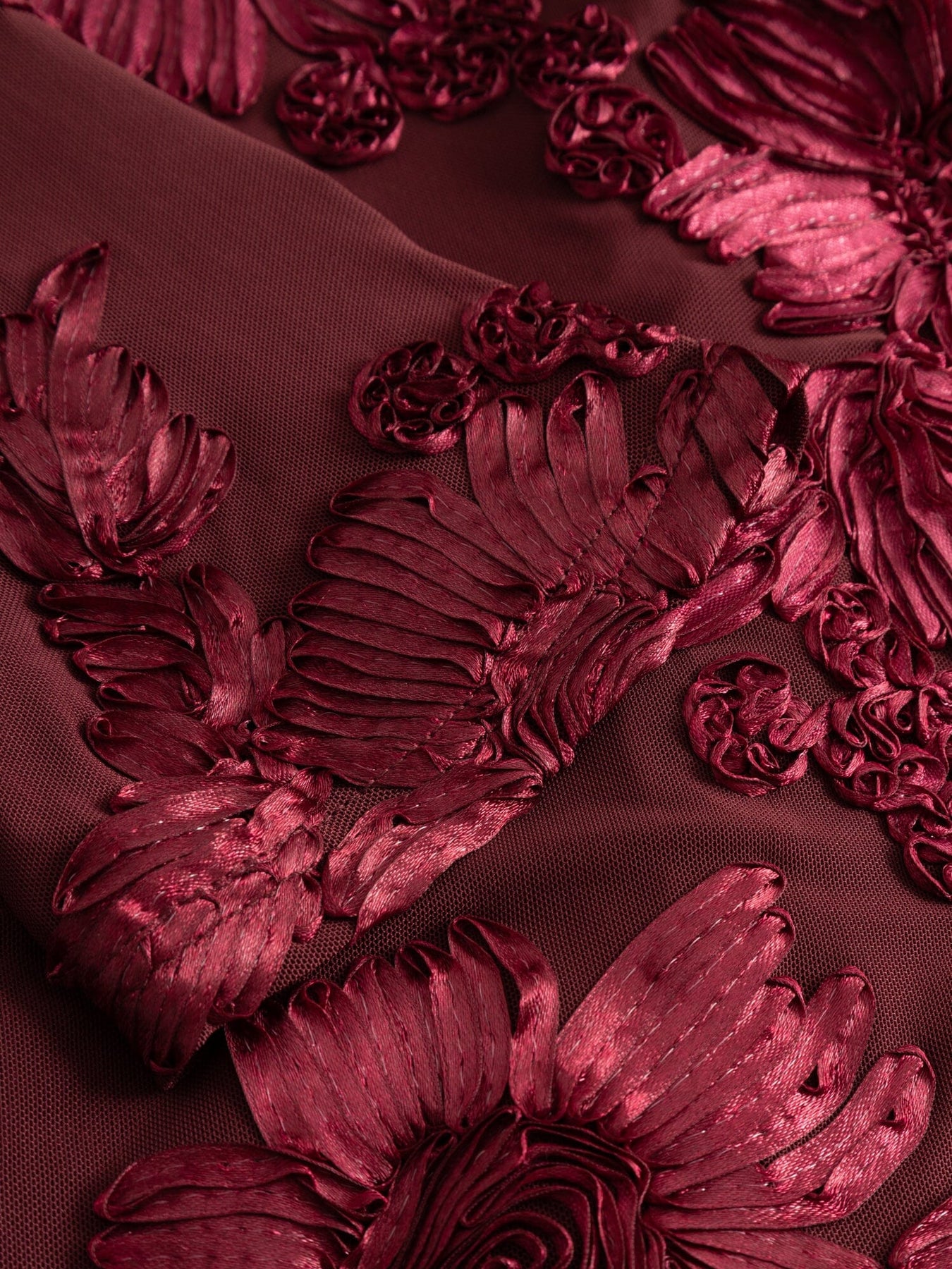 Knälång klänning från Noella i vinröd med 3D-blomstertryck. Den har v-ringning, 3/4-ärmar och detaljerad broderi med volanger.