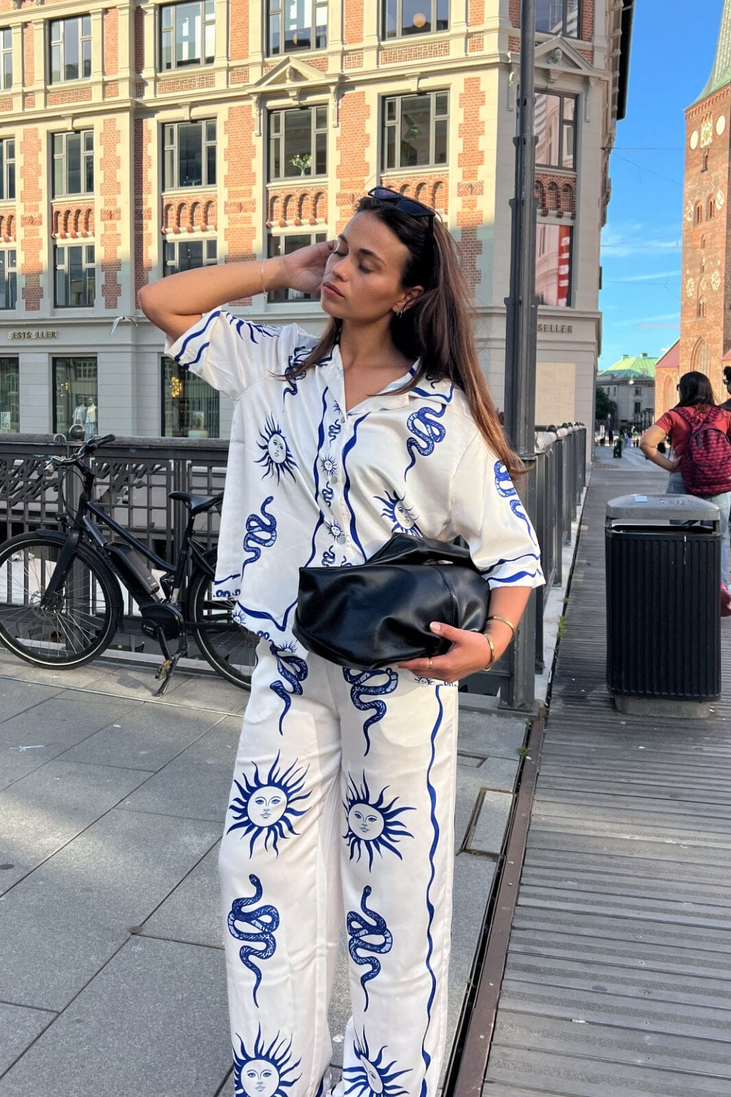 Skjorta från Noella med blått orm- och solmönster på vit bakgrund. Den lösa modellen har korta ärmar och klassisk skjortkrage med knapplåsning fram.