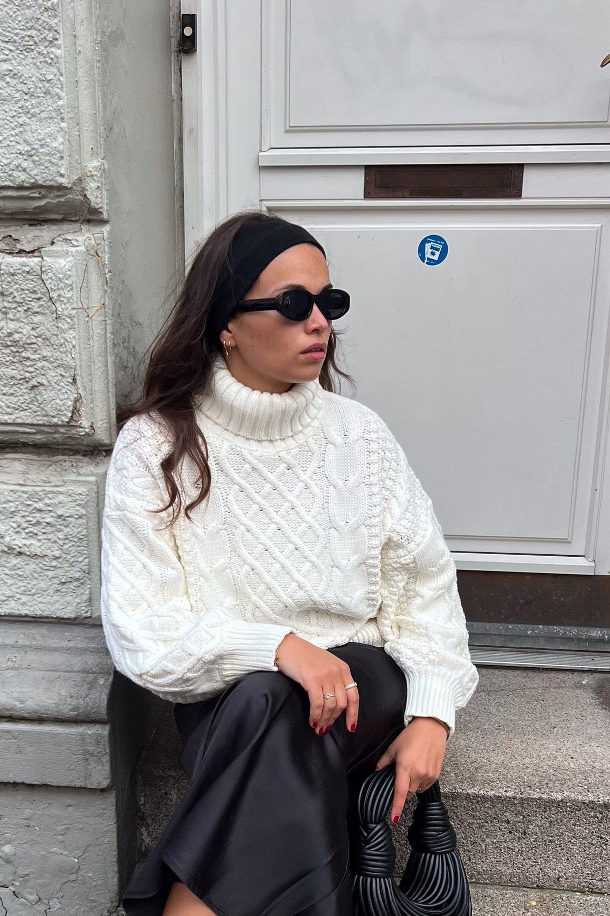 En off-white stickad tröja från Noella med kabelstickningsdetaljer på framsidan. Tröjan har en hög rullkrage och långa ärmar med flätmönster.
