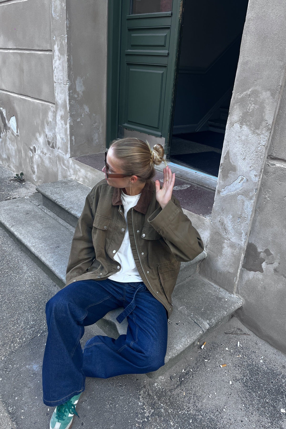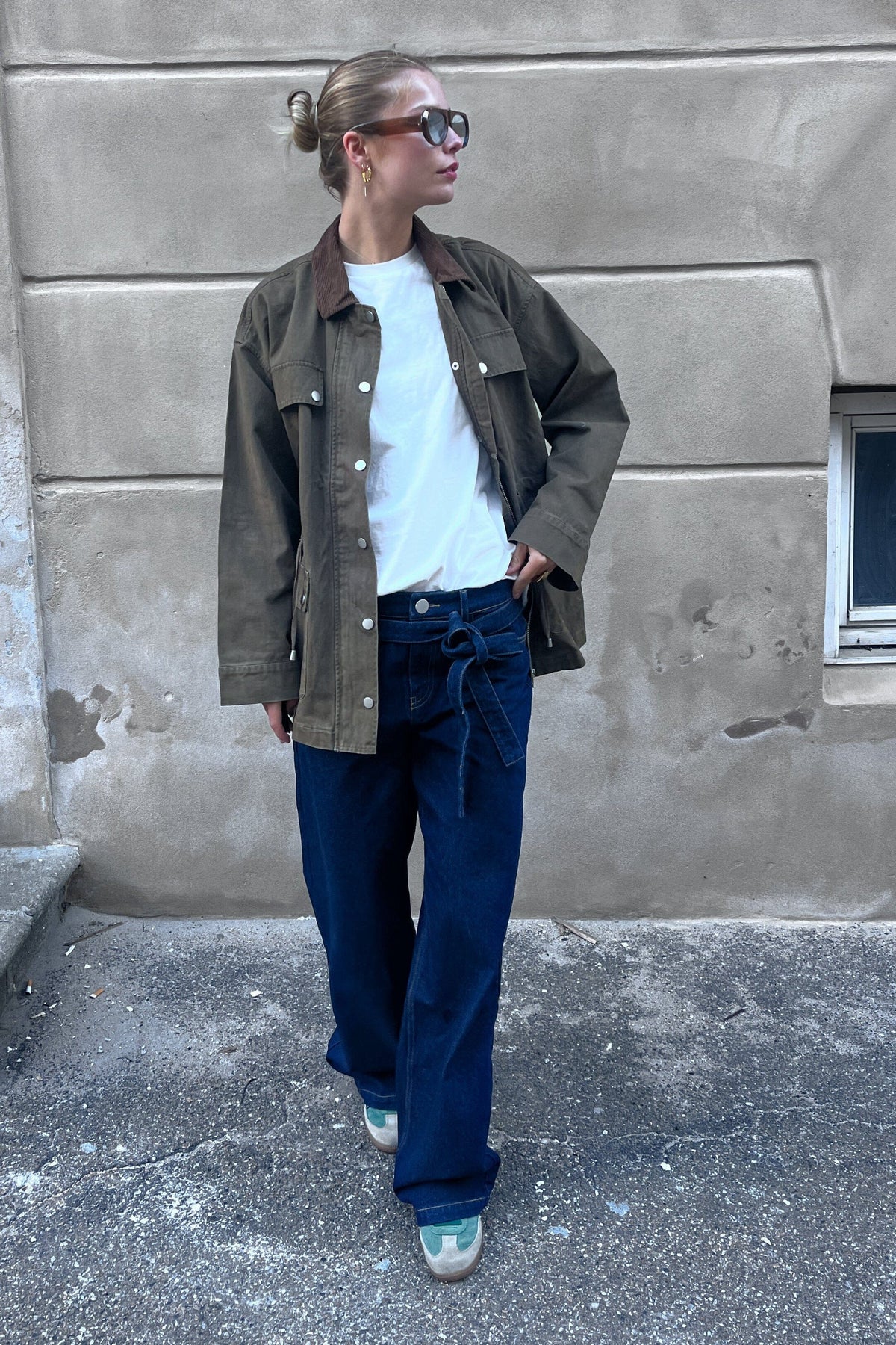 En jacka från Noella i 100 % bomull. Jackan är grön med en mörkare krage och har bindebandsdetaljer vid midjan.