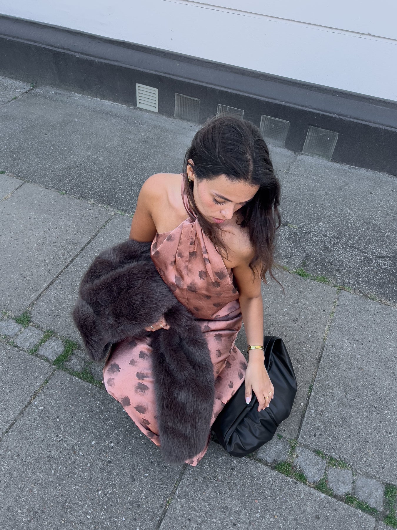 Blus från Noella med rostfärgat tryck i bruna och rosa nyanser. Blusen har en halterneck-design med bindband.