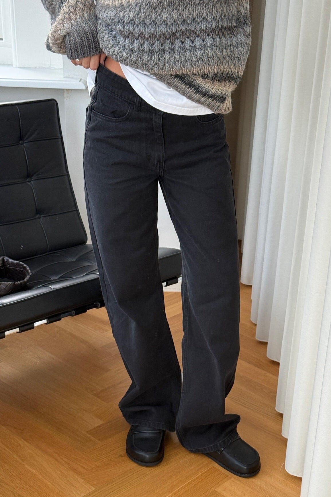Svarta jeans från Noella med bred benform. Byxorna har en medelhög midja och en lös passform som ger god rörelsefrihet. De kommer i en svart tvätt med rena linjer.