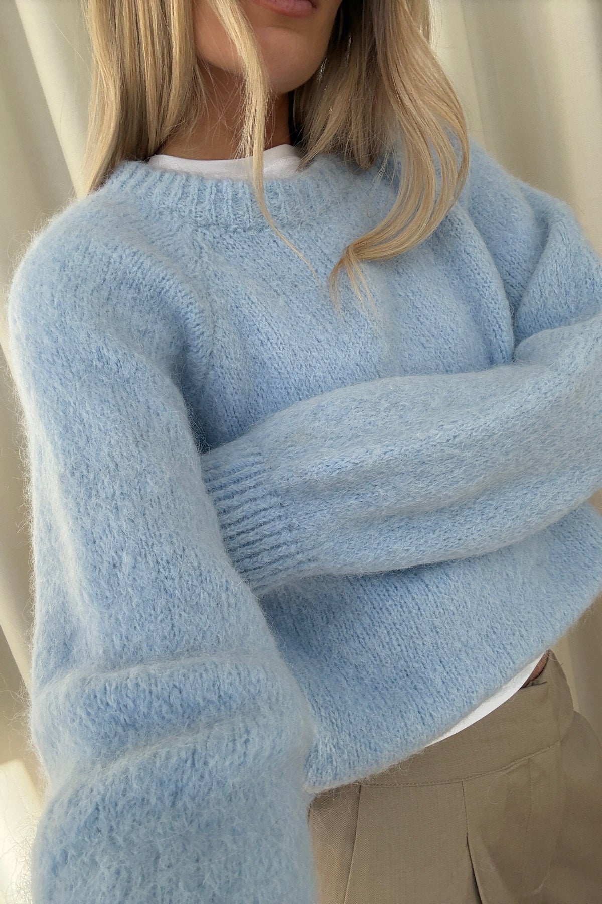 Stickad tröja från Noella i ljusblått. Tröjan är gjord av en blandning av alpacka och ull, har en lös passform och en rund halsringning.
