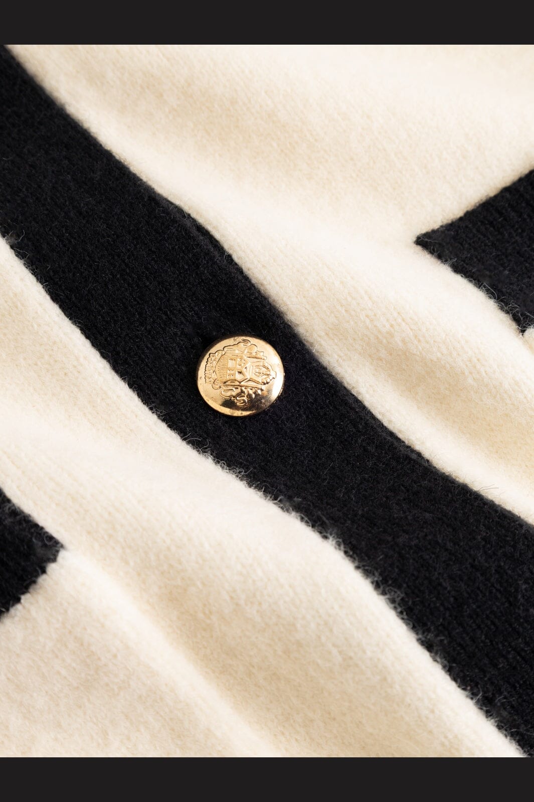 Vit stickad kofta från Noella med V-ringning och slim fit-passform. Koftan har långa ärmar och svarta kanter vid halsringningen och fickorna.