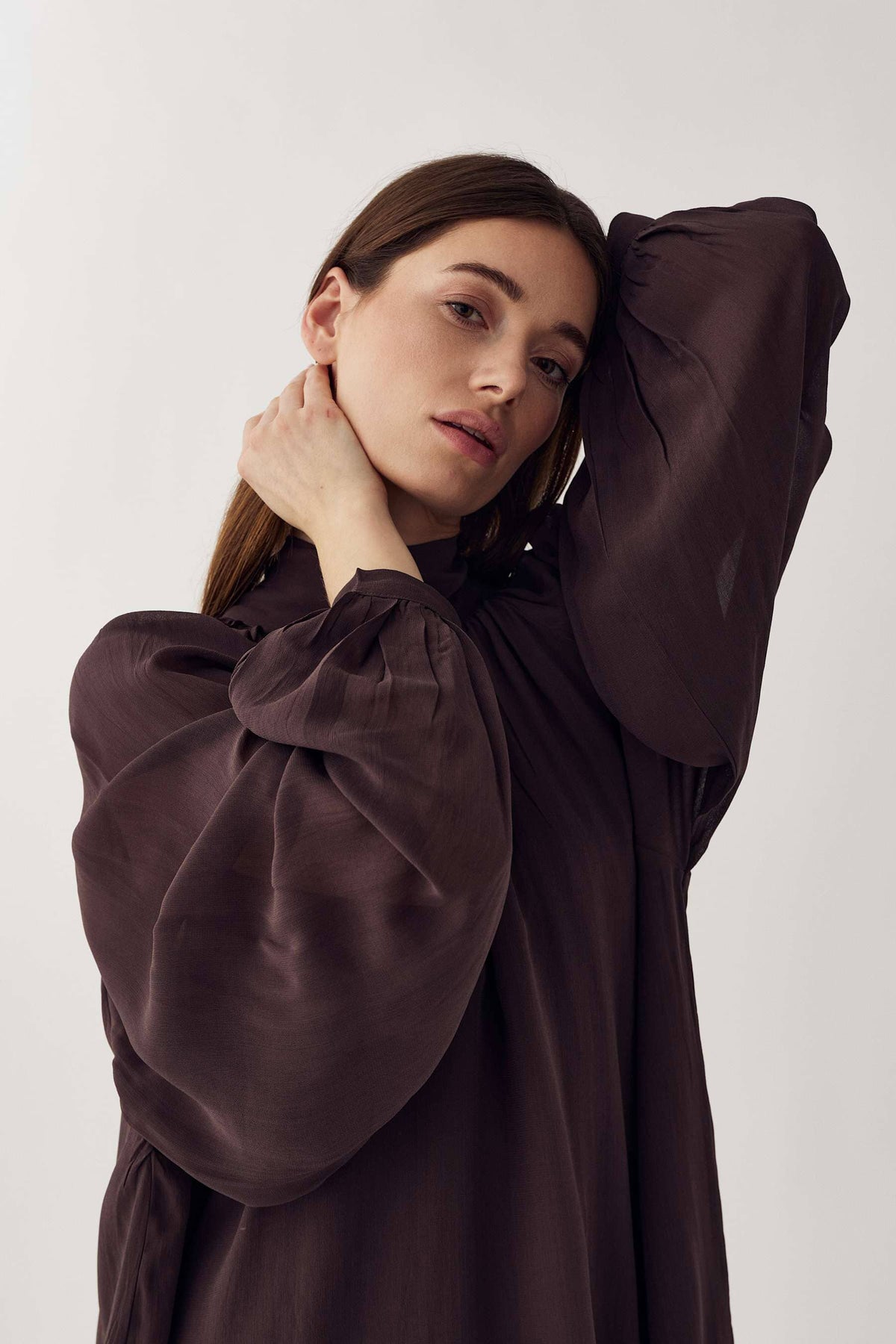 Chokladbrun klänning från Noella, tillverkad av 100 % viskos. Klänningen har en hög halsringning med rosett och långa ärmar med elastiska muddar.