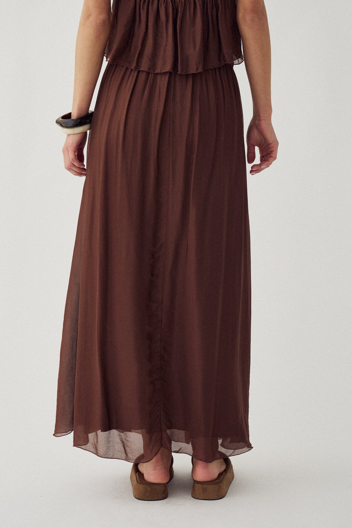 Brun kjol från Noella med lätt glänsande yta. Den långa kjolen har en lös passform och elastisk midja som ger god rörelsefrihet.