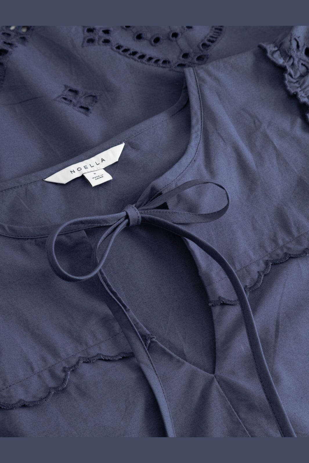 Klänning från Noella i dimblå. Tillverkad av 100 % bomull med broderade detaljer, knytband och spets.